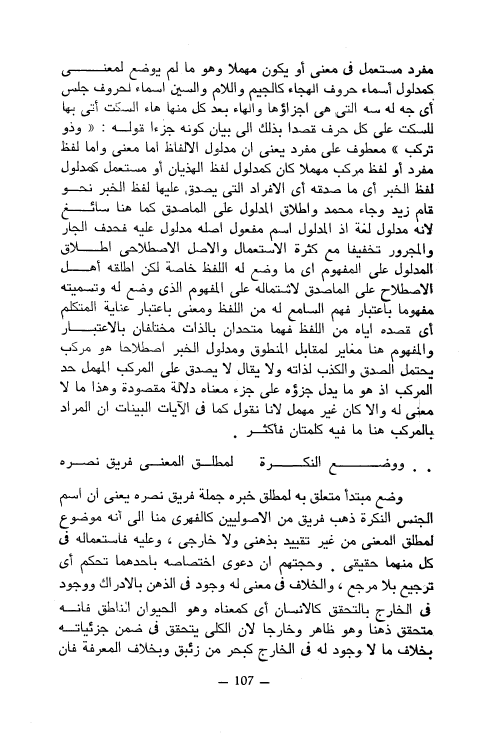 وضع مبتدأ متعلق به لمطلق خبره جملة فريق نصره يعني أن اسم الجنس النكرة ذهب فريق من الأصوليين كالفهري منا إلى أنه موضوع لمطلق المعنى من غير تقييد بذهني ولا خارجي، وعليه فاستعماله في كل منهما حقيقي. وحجتهم أن دعوى اختصاصه بأحدهما تحكم أي ترجيع بلا مرجع، والخلاف في معنى له وجود في الذهن بالإدراك ووجود في الخارج بالتحقق كالإنسان أي كمعناه وهو الحيوان الناطق فإنه متحقق ذهنًا وهو ظاهر وخارجًا لأن الكلي يتحقق في ضمن جزئياته بخلاف ما لا وجود له في الخارج كبحر من زئبق وبخلاف المعرفة فإن