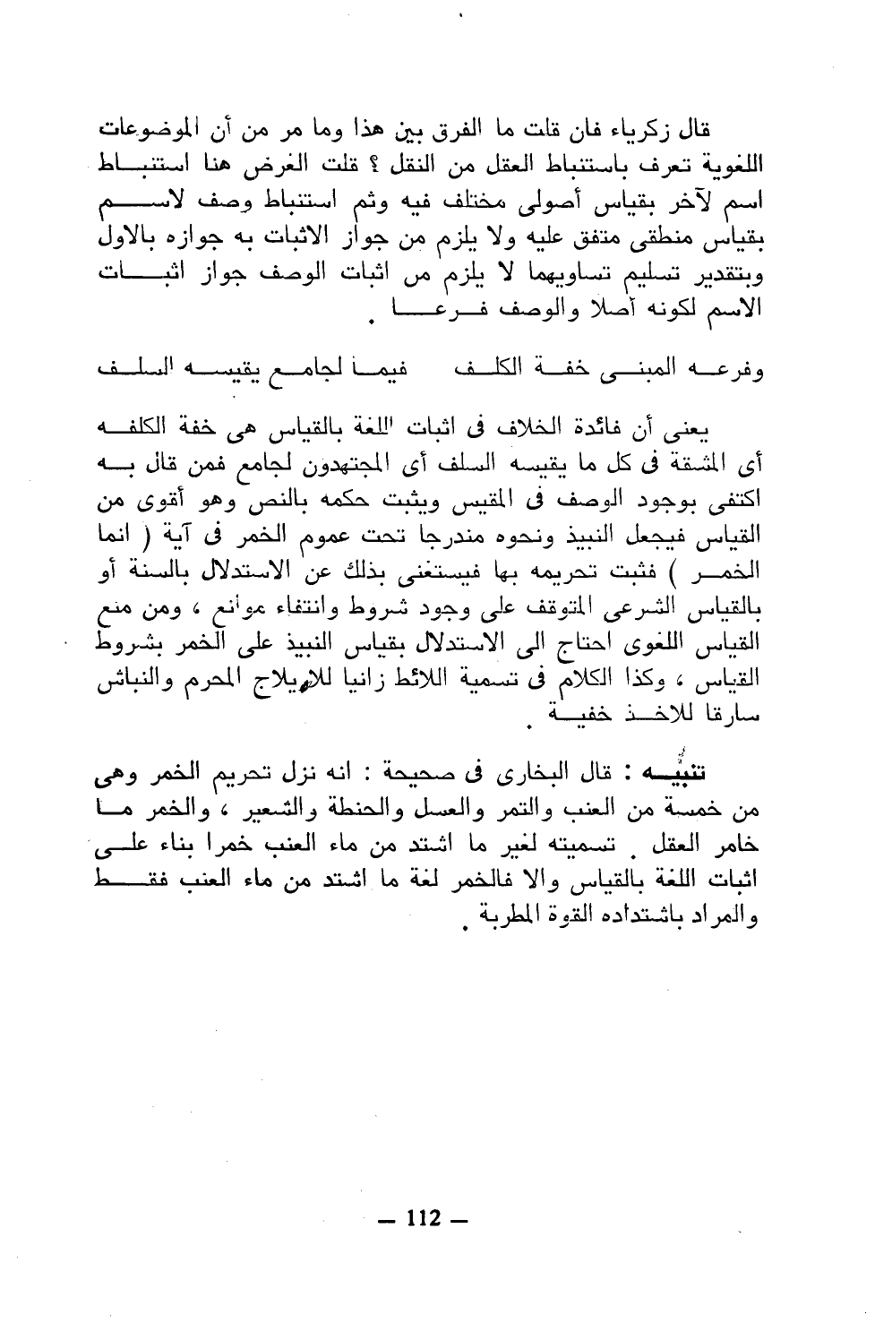 قال زكرياء فإن قلت ما الفرق بين هذا وما مر من أن الموضوعات اللغوية تعرف باستنباط العقل من النقل؟ قلت الغرض هنا استنباط اسم لآخر بقياس أصولي مختلف فيه وثم استنباط وصف لاسم بقياس منطقي متفق عليه ولا يلزم من جواز الإثبات به جوازه بالأول وبتقدير تسليم تساويهما لا يلزم من إثبات الوصف جواز إثبات الاسم لكونه أصلًا والوصف فرعًا.