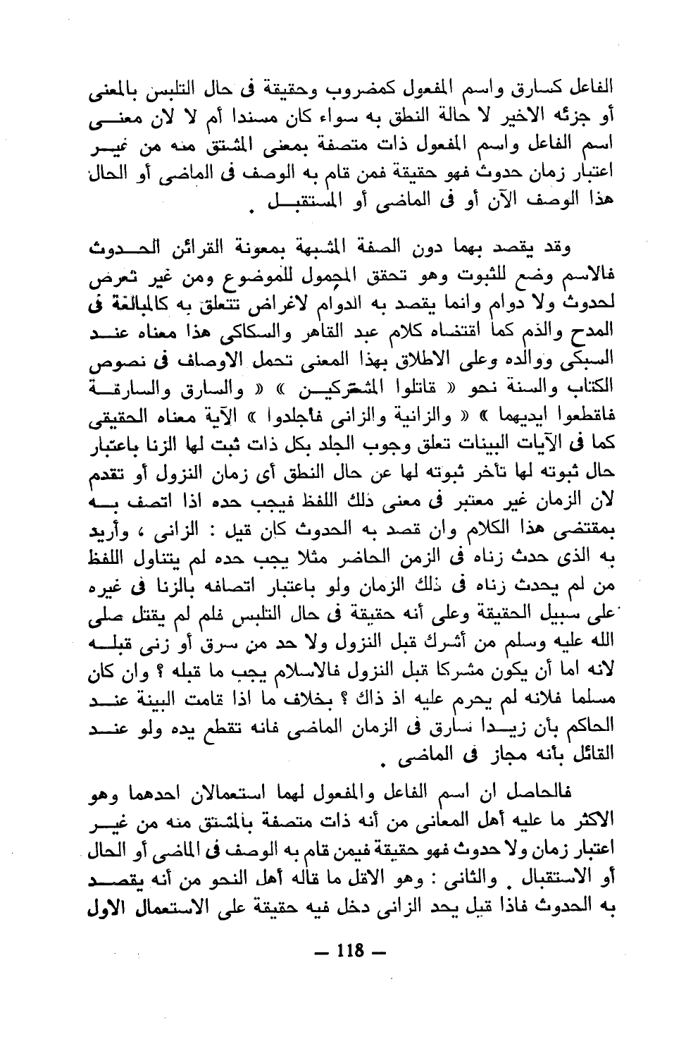 الفاعل كسارق واسم المفعول كمضروب وحقيقة في حال التلبس بالمعنى أو جزئه الأخير لا حالة النطق به سواء كان مسندًا أم لا لأن معنى اسم الفاعل واسم المفعول ذات متصفة بمعنى المشتق منه من غير اعتبار زمان حدوث فهو حقيقة فمن قام به الوصف في الماضي أو الحال هذا الوصف الآن أو في الماضي أو المستقبل.