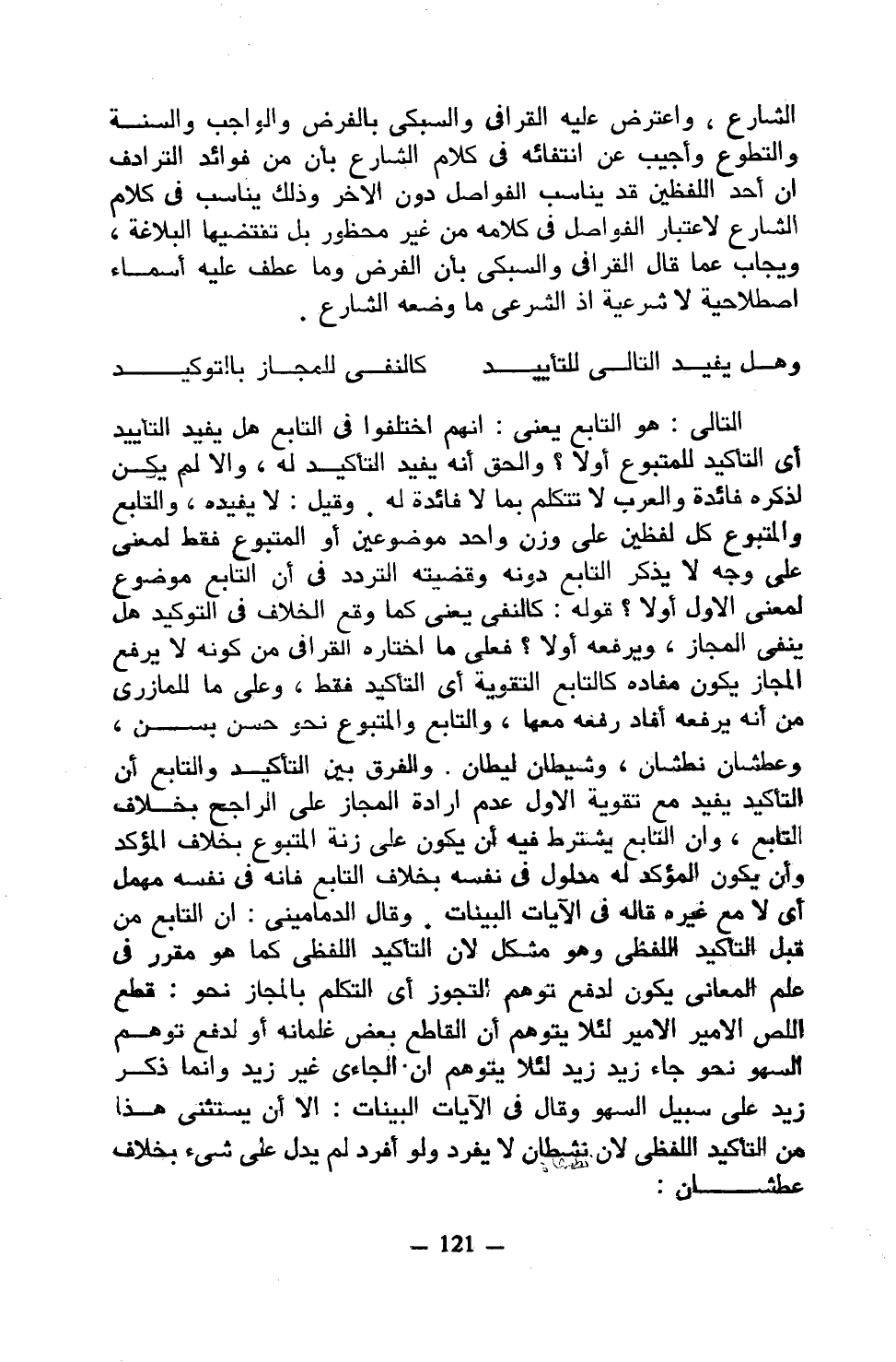 التالي: هو التابع يعني: إنهم اختلفوا في التابع هلي يفيد التأييد أي التأكيد للمتبوع أو لا؟ والحق أنه يفيد التأكيد له، وإلا لم يكن لذكره فائدة والعرب لا تتكلم بما لا فائدة له. وقيل: لا يفيده، والتابع والمتبوع كل لفظين على وزن واحد موضوعين أو المتبوع فقط لمعنى على وجه لا يذكر التابع دونه وقضيته التردد في أن التابع موضوع لمعنى الأول أو لا؟ قوله: كالنفي يعني كما وقع الخلاف في التوكيد هل ينفي المجاز، ويرفعه أولا؟ فعلى ما اختاره القرافي من كونه لا يرفع المجاز يكون مفاده كالتابع التقوية أي التأكيد فقط، وعلى ما للمازري من أنه يرفعه أفاد رفعه معها، والتابع والمتبوع نحو حسن بسن، وعطشان نطشان، وشيطان ليطان. والفرق بين التأكيد والتابع أن التأكيد يفيد مع تقوية الأول عدم إرادة المجاز على الراجح بخلاف التابع، وأن التابع يشترط فيه أن يكن على زنة المتبوع بخلاف المؤكد وأن يكون المؤكد له مطول في نفسه بخلاف التابع فإنه في نفسه مهمل أي لا مع غيره قاله في الآيات البينات. وقال الدماميني: أن التابع من قبل التأكيد اللفظي وهو مشكل لأن التأكيد اللفظي كما هو مقرر في علم المعاني يكون لدفع توهم التجوز أي التكلم بالمجاز نحو: قطع اللص الأمير الأمير لئلا يتوهم أن القاطع بعض غلمانه أو لدفع توهم السهو نحو جاء زيد زيد لئلا يتوهم أن الجاءي غير زيد وإنما ذكر زيد على سبيل السهو وقال في الآيات البينات: إلا أن يستثنى هذا من التأكيد اللفظي لأن نشطان لا يفرد ولو أفرد لم يدل على شيء بخلاف عطشان: