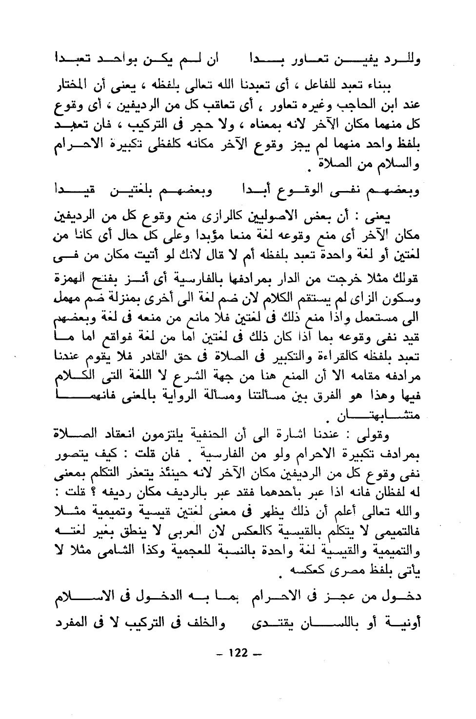 وقولي: عندنا إشارة إلى أن الحنفية يلتزمون انعقاد الصلاة بمرادف تكبيرة الإحرام ولو من الفارسية. فإن قلت: كيف يتصور نفي وقوع كل من الرديفين مكان الآخر لأنه حينئذ يتعذر التكلم بمعنى له لفظان فإنه إذا عبر بأحدهما فقد عبر بالرديف مكان رديفه؟ قلت: والله تعالى أعلم أن ذلك يظهر في معنى لغتين قيسية وتميمية مثلًا فالتميمي لا يتكلم بالقيسية كالعكس لأن العربي لا ينطق بغير لغته والتميمية والقيسية لغة واحدة بالنسبة للعجمية وكذا الشامي مثلًا لا يأتي بلفظ مصري كعكسه.
