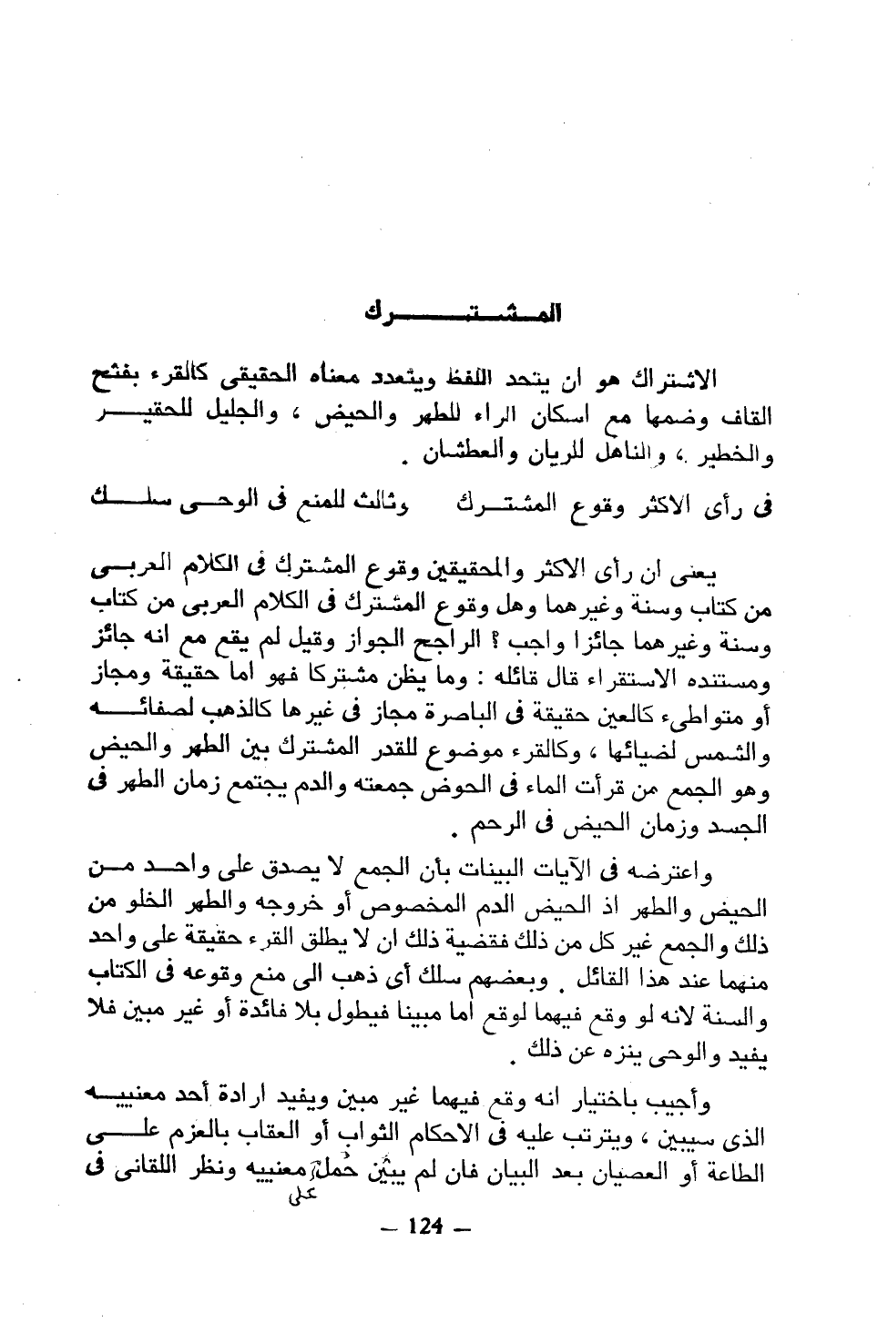 يعني أن رأى الأكثر والمحققين وقوع المشترك في الكلام العربي من كتاب وسنة وغيرهما وهل وقوع المشترك في الكلام العربي من كتاب وسنة وغيرهما جائزًا واجب؟ الراجح الجواز وقيل لم يقع مع أنه جائز ومستنده الاستقراء قال قائله: وما يظن مشتركًا فهو إما حقيقة ومجاز أو متواطئ كالعين حقيقة في الباصرة مجاز في غيرها كالذهب لصفائه والشمس لضيائها، وكالقرء موضوع للقدر المشترك بين الطهر والحيض وهو الجمع من قرأت الماء في الحوض جمعته والدم يجتمع زمان الطهر في الجسد وزمان الحيض في الرحم.