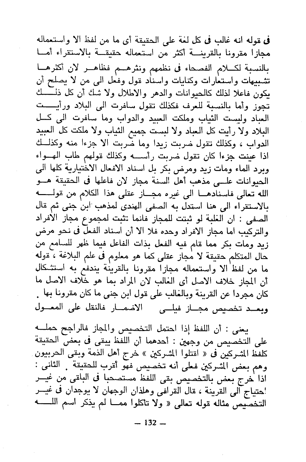 في قوله أنه غالب في كل لغة على الحقيقة أي ما من لفظ إلا واستعماله مجازا مقرونا بالقرينة أكثر من استعماله حقيقة بالاستقراء أما بالنسبة لكلام الفصحاء في نظمهم ونثرهم فظاهر لأن أكثرها تشبيهات واستعارات وكنايات وإسناد قول وفعل إلى من لا يصلح أن يكون فاعلا لذلك كالحيوانات والدهر والأطلال ولا شك أن كل ذلك تجوز وأما بالنسبة للعرف فكذلك تقول سافرت إلى البلاد ورأيت العباد ولبست الثياب وملكت العبيد والدواب وما سافرت إلى كل البلاد ولا رأيك كل العباد ولا لبست جميع الثياب ولا ملكت كل العبيد الدواب، وكذلك تقول ضربت زيدا وما ضربت إلا جزءا منه وكذلك إذا عنيت جزءا كان تقول ضربت رأسه وكذلك قولهم طاب الهواء وبرد الماء ومات زيد ومرض بكر بل إسناد الأفعال الاختيارية كلها إلى الحيوانات على مذهب أهل السنة مجاز لأن فاعلها في الحقيقة هو الله تعالى فإسنادها إلى غيره مجاز عقلي هذا الكلام من قوله بالاستقراء إلى هنا استدل به الصفي الهندي لمذهب ابن جنى ثم قال الصفي: أن الغلبة لو ثبتت للمجاز فإنما تثبت لمجموع مجاز الأفراد والتركيب أما مجاز الأفراد وحده فلا إلا أن إسناد الفعل في نحو مرض زيد ومات بكر مما قام فيه الفعل بذات الفعل فيما ظهر للسامع من حال المتكلم حقيقة لا مجاز عقلي كما هو معلوم في علم البلاغة، قوله ما من لفظ إلا واستعماله مجازا مقرونا بالقرينة يندفع به استشكال أن المجاز خلاف الأصل أي الغالب لأن المراد بما هو خلاف الأصل ما كان مجردا عن القرينة وبالغالب على قول ابن جنى ما كان مقرونا بها.