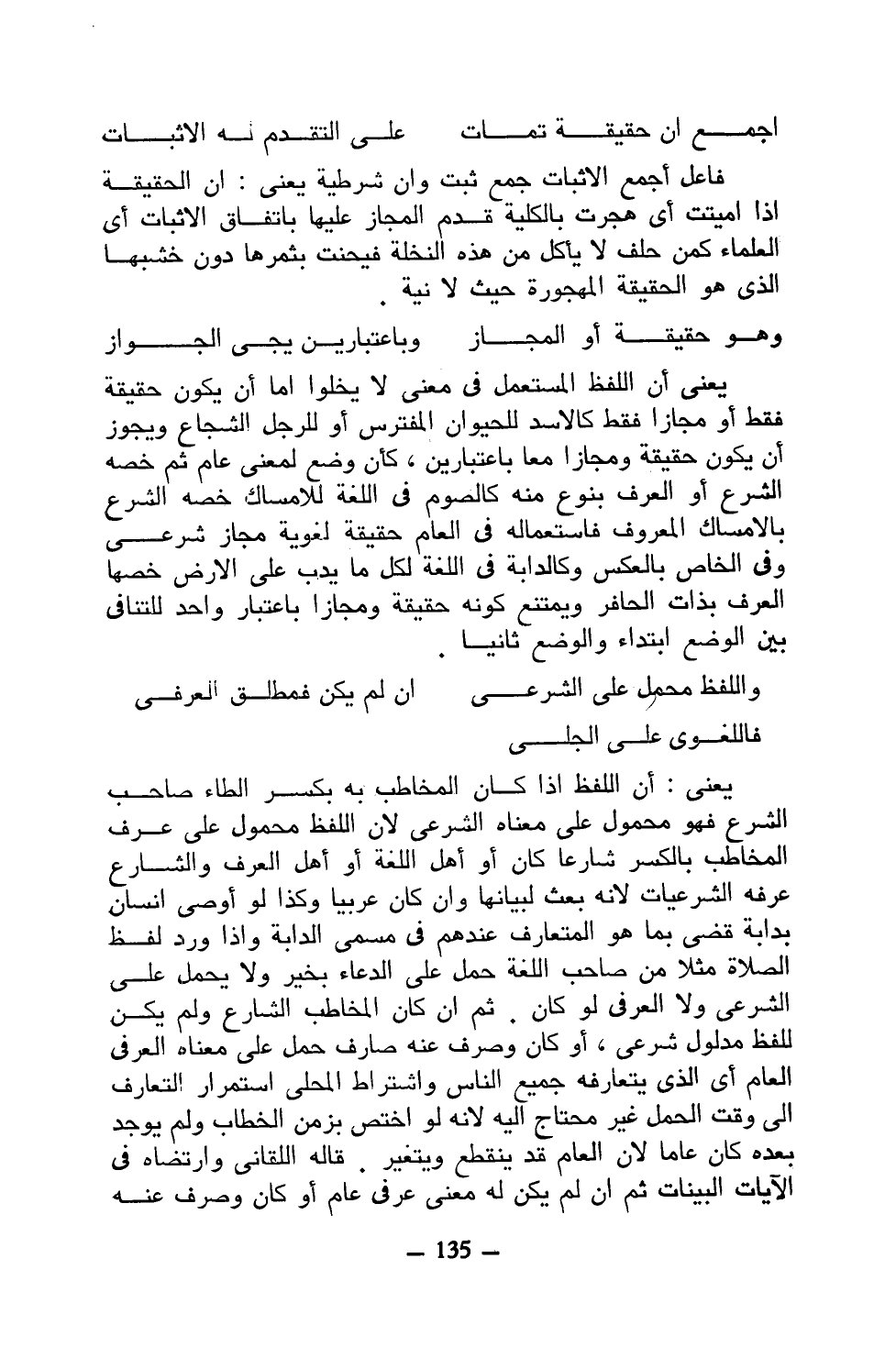 يعني: أن اللفظ إذا كان المخاطب به بكسر الطاء صاحب الشرع فهو محمول على معناه الشرعي لأن اللفظ محمول على عرف المخاطب بالكسر شارعا كان أو أهل اللغة أو أهل العرف والشارع عرفه الشرعيات لأنه بعث لبيانها وإن كان عربيا وكذا لو أوصى إنسان بدابة قضى بما هو المتعارف عندهم في مسمى الدابة وإذا ورد لفظ الصلاة مثلا من صاحب اللغة حمل على الدعاء بخير ولا يحمل على الشرعي ولا العرفي لو كان. ثم إن كان المخاطب الشارع ولم يكن للفظ مدلول شرعي، أو كان وصرف عنه صارف حمل على معناه العرفي العام أي الذي يتعارفه جميع الناس واشتراط المحلى استمرار التعارف إلى وقت الحمل غير محتاج إليه لأنه لو اختص بزمن الخطاب ولم يوجد بعده كان عاما لأن العام قد ينقطع ويتغير. قال اللقاني وارتضاه في الآيات البينات ثم إن لم يكن له معنى عرفي عام أو كان وصرف عنه