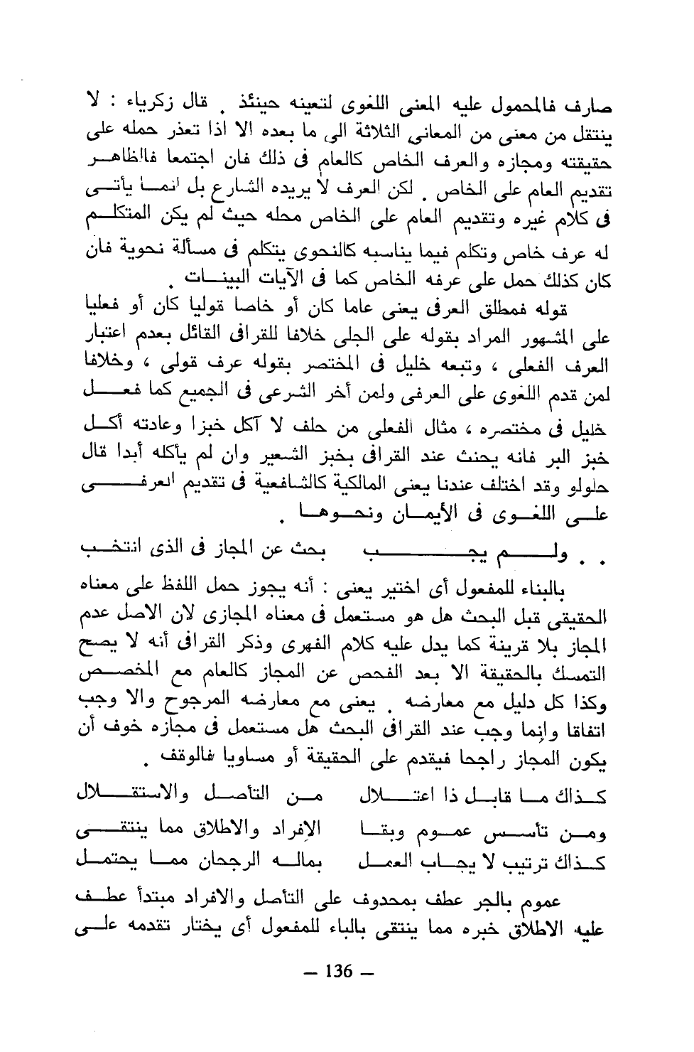 صارف فالمحمول عليه المعنى اللغوي لتعينه حينئذ. قال زكرياء: لا ينتقل من معنى من المعاني الثلاثة إلى ما بعده إلا إذا تعذر حمله على حقيقته ومجازه والعرف الخاص كالعام في ذلك فإن اجتمعا فالظاهر تقديم العام على الخاص. لكن العرف لا يريده الشارع بل إنما يأتي في كلام غيره وتقديم العام على الخاص محله حيث لم يكن المتكلم له عرف خاص وتكلم فيما يناسبه كالنحوي يتكلم في مسألة نحوية فإن كان كذلك حمل على عرفه الخاص كما في الآيات البينات.
