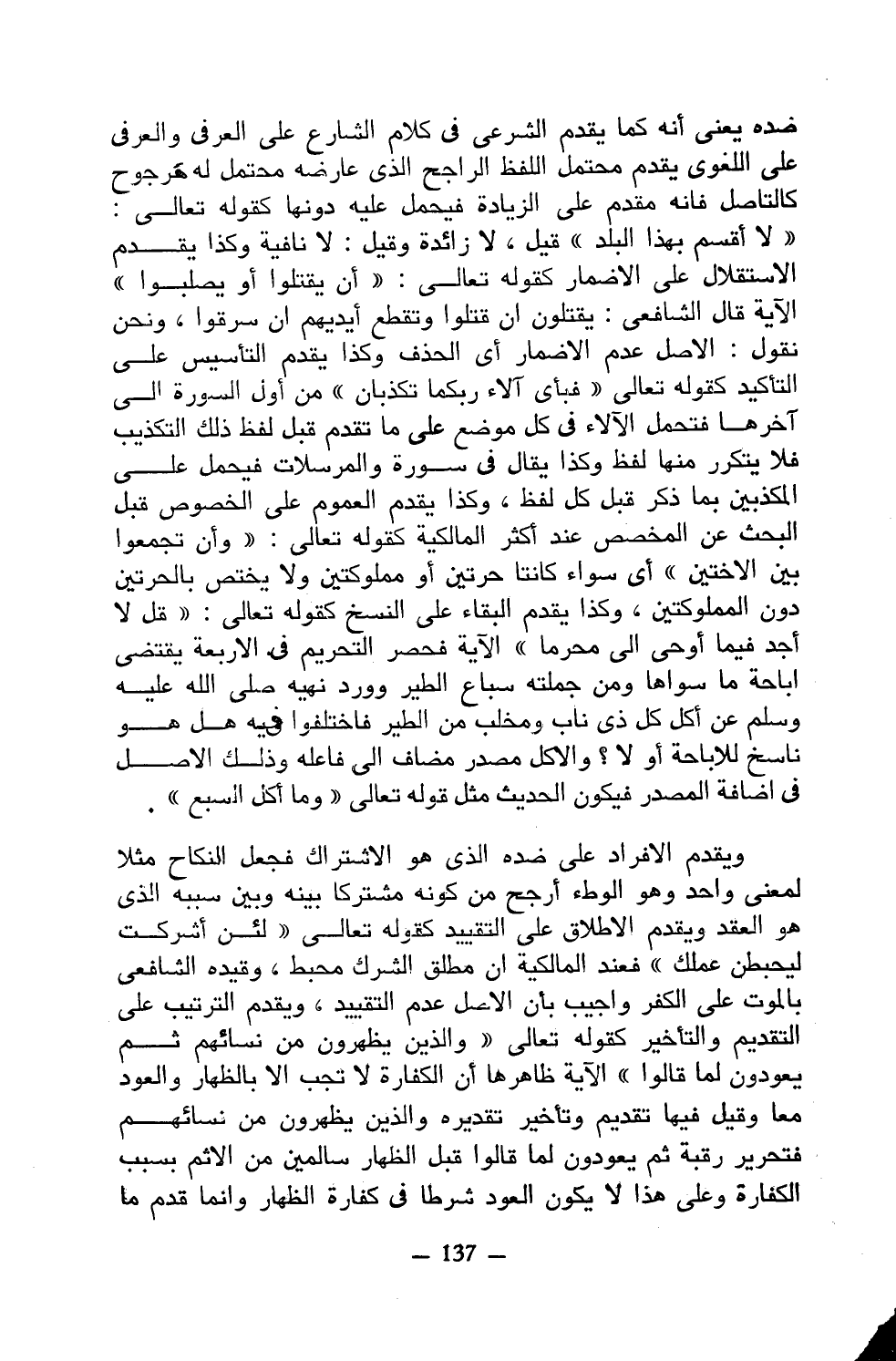 ويقدم الإفراد على ضده الذي هو الاشتراك فجعل النكاح مثلا لمعنى واحد وهو الوطء أرجح من كونه مشتركا بينه وبين سببه الذي هو العقد ويقدم الإطلاق على التقييد كقوله تعالى ((لئن أشركت ليحبطن عملك)) فعند المالكية أن مطلق الشرك محبط، وقيده الشافعي بالموت على الكفر وأجيب بأن الأصل عدم التقييد، ويقدم الترتيب على التقديم والتأخير كقوله تعالى ((والذين يظهرون من نسائهم ثم يعودون لما قالوا)) الآية ظاهرها أن الكفارة لا تجب إلا بالظهار والعود معا وقيل فيها تقديم وتأخير تقديره والذين يظهرون من نسائهم فتحرير رقبة ثم يعودون لما قالوا قبل الظهار سالمين من الإثم بسبب الكفارة وعلى هذا لا يكون العود شرطا في كفارة الظهار وإنما قدم ما