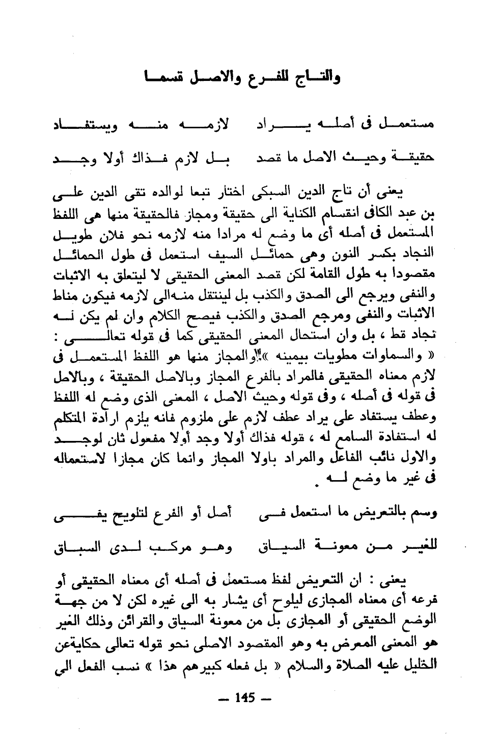 يعني أن تاج الدين السبكي اختار تبعا لوالده تقي الدين علي بن عبد الكافي انقسام الكناية إلى حقيقة ومجاز فالحقيقة منها هي اللفظ المستعمل في أصله أي ما وضع له مرادا منه لازمه نحو فلان طويل النجاد بكسر النون وهي حمائل السيف استعمل في طول الحمائل مقصودا به طول القامة لكن قصد المعنى الحقيقي لا ليتعلق به الإثبات والنفي ويرجع إلى الصدق والكذب بل لينتقل منه إلى لازمه فيكون مناط الإثبات والنفي ومرجع الصدق والكذب فيصح الكلام وإن لم يكن له نجاد قط، بل وإن استحال المعنى الحقيقي كما في قوله تعالى: ((والسماوات مطويات بيمينه)) والمجاز منها هو اللفظ المستعمل في لازم معناه الحقيقي فالمراد بالفرع المجاز وبالأصل الحقيقة، وبالأصل في قوله في أصله، وفي قوله وحيث الأصل، المعنى الذي وضع له اللفظ وعطف يستفاد على يراد عطف لازم على ملزوم فإنه يلزم إرادة المتكلم له استفادة السامع له، قوله فذاك أولا وجد أولا مفعول ثان لوجد والأول نائب الفاعل والمراد باولا المجاز وإنما كان مجازا لاستعماله في غير ما وضع له.