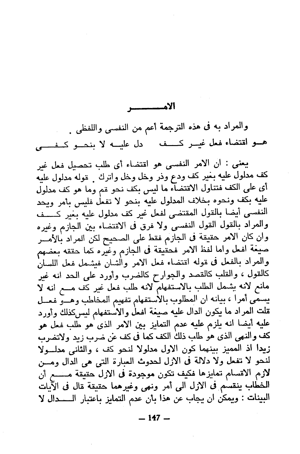يعني: أن الأمر النفسي هو اقتضاء أي طلب تحصيل فعل غير كف مدلول عليه بغير كف ودع وذر وخل وخل واترك. قوله مدلول عليه أي على الكف فتناول الاقتضاء ما ليس بكف نحو قم وما هو كف مدلول عليه بكف ونحوه بخلاف المدلول عليه بنحو لا تفعل فليس بأمر ويحد النفسي أيضا بالقول المقتضى لفعل غير كف مدلول عليه بغير كف والمراد بالقول القول النفسي ولا فرق في الاقتضاء بين الجازم وغيره وإن كان الأمر حقيقة في الجازم فقط على الصحيح لكن المراد بالأمر صيغة افعل وأما لفظ الأمر فحقيقة في الجازم وغيره كما حققه بعضهم والمراد بالفعل في قوله اقتضاء فعل الأمر والشان فيشمل فعل اللسان كالقول، والقلب كالقصد والجوارح كالضرب وأورد على الحد أنه غير مانع لأنه يشمل الطلب بالاستفهام لأنه طلب فعل غير كف مع أنه لا يسمى أمرا، بيانه أن المطلوب بالاستفهام تفيهم المخاطب وهو فعل قلت المراد ما يكون الدال عليه صيغة افعل والاستفهام ليس كذلك وأورد عليه أيضا أنه يلزم عليه عدم التمايز بين الأمر الذي هو طلب فعل هو كف والنهي الذي هو طلب ذلك الكف كما في كف عن ضرب زيد ولا تضرب زيدا إذ المميز بينهما كون الأول مدلولا لنحو كف، والثاني مدلولا لنحو لا تفعل ولا دلالة في الأزل لحدوث العبارة التي هي الدال ومع لازم الأقسام تمايزها فكيف تكون موجودة في الأزل حقيقة مع أن الخطاب ينقسم في الأزل إلى أمر ونهي وغيرهما حقيقة قال في الآيات البينات: ويمكن أن يجاب عن هذا بأن عدم التمايز باعتبار الدال لا