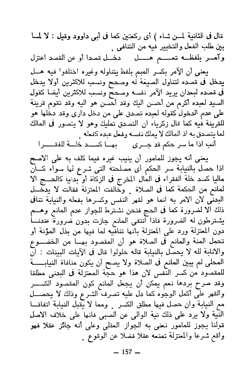 يعني أنه يجوز للمأمور أن ينيب غيره فيما كلف به على الأصح إذا حصل بالنيابة سر الحكم أي مصلحته التي شرع لها سواء كان ماليا كسد خلة الفقراء في المال المخرج في الزكاة أو بدنيا كالحج إلا لمانع من الحكمة كما في الصلاة. وخالفت المعتزلة فقال لا يدخل البدني لأن الأمر به إنما هو لقهر النفس وكسرها بفعله والنيابة تنافي ذلك إلا لضرورة كما في الحج فنحن نشترط للجواز عدم المانع وهم يشترطون له الضرورة فإذا انتفى المانع جازت بدون ضرورة عندنا دون المعتزلة ورد على المعتزلة بأنها تنافيه لما فيها من بذل المؤنة أو تحمل المنة والمانع في الصلاة هو أن المقصود بها من الخضوع والإنابة لله لا يحصل بالنيابة قاله حلولوا قال في الآيات البينات: إن المحلى لم يبين المانع في الصلاة ولا يصح أن يكون منافاة النيابة للمقصود من كسر النفس لأن هذا هو حجة المعتزلة في البدني مطلقًا وقد صرح بردها نعم يمكن أن يجعل المانع كون المقصود الكسر والقهر على أكمل الوجوه كما دل عليه تصرف الشرع وذلك لا يحصل مع النيابة وإن حصل فيها مطلق الكسر. ومما لا يقبل النيابة اتفاقا النية ولا يرد على ذلك نية الوالي عن الصبي فإنها على خلاف الأصل قولنا يجوز للمأمور نعني به الجواز العقلي وعلى أنه جائز عقلا فهو واقع شرعا والمعتزلة تمنعه عقلا فضلا عن الوقوع.