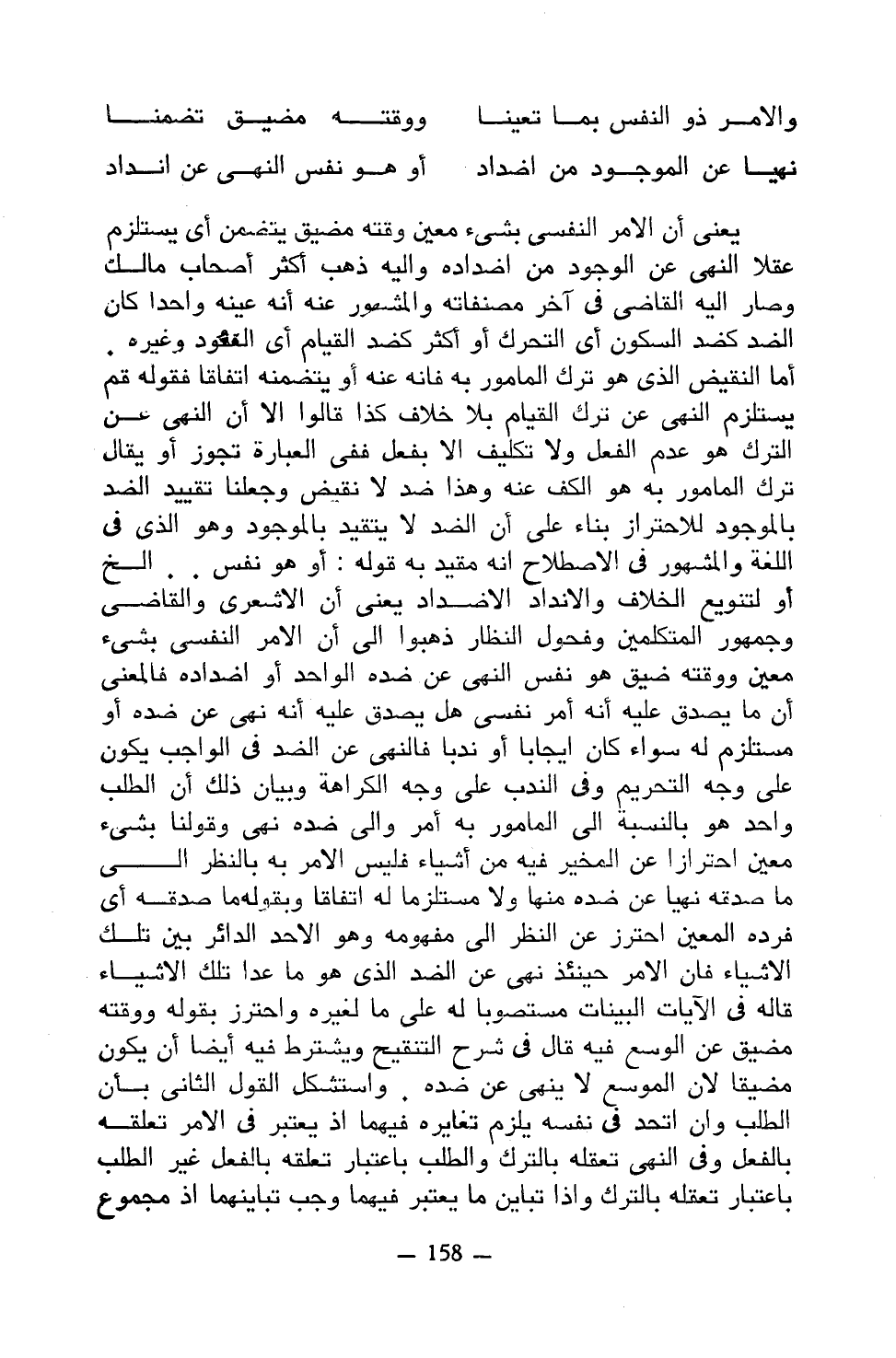 أما النقيض الذي هو ترك المأمور به فإنه عنه أو يتضمنه اتفاقًا فقوله قم يستلزم النهي عن ترك القيام بلا خلاف كذا قالوا إلا أن النهي عن الترك هو عدم الفعل ولا تكليف إلا بفعل ففي العبارة تجوز أو يقال ترك المأمور به هو الكف عنه وهذا ضد لا نقيض وجعلنا تقييد الضد بالموجود للاحتراز بناء على أن الضد لا يتقيد بالموجود وهو الذي في اللغة والمشهور في الاصطلاح أنه مقيد به قوله: أو هو نفس .. الخ أو لتنويع الخلاف والأنداد الأضداد يعني أن الأشعري والقاضي وجمهور المتكلمين وفحول النظار ذهبوا إلى أن الأمر النفسي بشيء معين ووقته ضيق هو نفس النهي عن ضده الواحد أو أضداده فالمعنى أن ما يصدق عليه أنه أمر نفسي هل يصدق عليه أنه نهى عن ضده أو مستلزم له سواء كان إيجابا أو ندبا فالنهي عن الضد في الواجب يكون على وجه التحريم وفي الندب على وجه الكراهية وبيان ذلك أن الطلب واحد هو بالنسبة إلى المأمور به أمر والي ضده نهى وقولنا بشيء معين احتراز عن المخير فيه من أشياء فليس الأمر به بالنظر إلى ما صدقه نهيا عن ضده منها ولا مستلزما له اتفاقا وبقوله ما صدقه أي فرده المعين احترز عن النظر إلى مفهومه وهو الأحد الدائر بين تلك الأشياء فإن الأمر حينئذ نهى عن الضد الذي هو ما عدا تلك الأشياء قاله في الآيات البينات مستصوبا له على ما لغيره واحترز بقوله ووقته مضيق عن الوسع فيه قال في شرح التنقيح ويشترط فيه أيضا أن يكون مضيقا لأن الموسع لا ينهى عن ضده. واستشكل القول الثاني بأن الطلب وأن اتحد في نفسه يلزم تغايره فيهما إذ يعتبر في الأمر تعلق بالفعل وفي النهي تعقله بالترك والطلب باعتبار تعلقه بالفعل غير الطلب باعتبار تعقله بالترك وإذا تباين ما يعتبر فيهما وجب تباينهما إذ مجموع