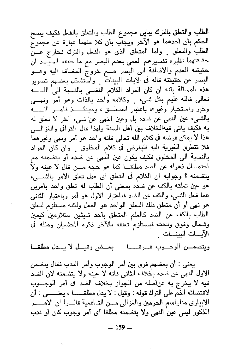 الطلب والتعلق بالترك يباين مجموع الطلب والتعلق بالفعل فكيف يصح الحكم بأن أحدهما هو الآخر ويجاب بأن كلا منهما عبارة عن مجموع الطلب والتعلق. وأما المتعلق الذي هو الفعل والترك فخارج عن حقيقتهما نظيره تفسيرهم العمى بعدم البصر مع ما حققه السيد أن حقيقته العدم والإضافة إلى البصر مع خروج المضاف إليه وهو البصر عن حقيقته قاله في الآيات البينات. واستشكل بعضهم تصوير هذه المسألة بأنه إن كان المراد الكلام النفسي بالنسبة إلى الله تعالى فالله عليم بكل شيء. وكلامه واحد بالذات وهو أمر ونهي وخبر واستخبار وغيرها باعتبار المتعلق، وحينئذ فأمر الله بالشيء عين النهي عن ضده بل وعين النهي عن شيء آخر لا تعلق له به فكيف يأتي فيه الخلاف بين أهل السنة ولهذا قال القرافي والغزالي هذا لا يمكن فرضه في كلام الله تعالى فإنه واحد هو أمر ونهي وغيرهما فلا تتطرق الغيرية إليه فليفرض في كلام المخلوق. وإن كان المراد بالنسبة إلى المخلوق فكيف يكون عين النهي عن ضده أو يتضمنه مع احتمال ذهوله عن الضد مطلقًا كما هو حجة من قال لا عينه ولا يتضمنه؟ وجوابه أن الكلام في التعلق أي فهل تعلق الأمر بالشيء هو عين تعلقه بالكف عن ضده بمعنى أن الطلب له تعلق واحد بأمرين هما فعل الشيء والكف عن الضد فباعتبار الأول هو أمر وباعتبار الثاني هو نهي أو أن متعلق ذلك التعلق الواحد هو الفعل ولكنه مستلزم لتعلق الطلب بالكف عن الضد كالعلم المتعلق بأحد شيئين متلازمين كيمين وشمال وفوق وتحت فيسلتزم تعلقه بالآخر ذكر المحشيان ومثله في الآيات البينات.