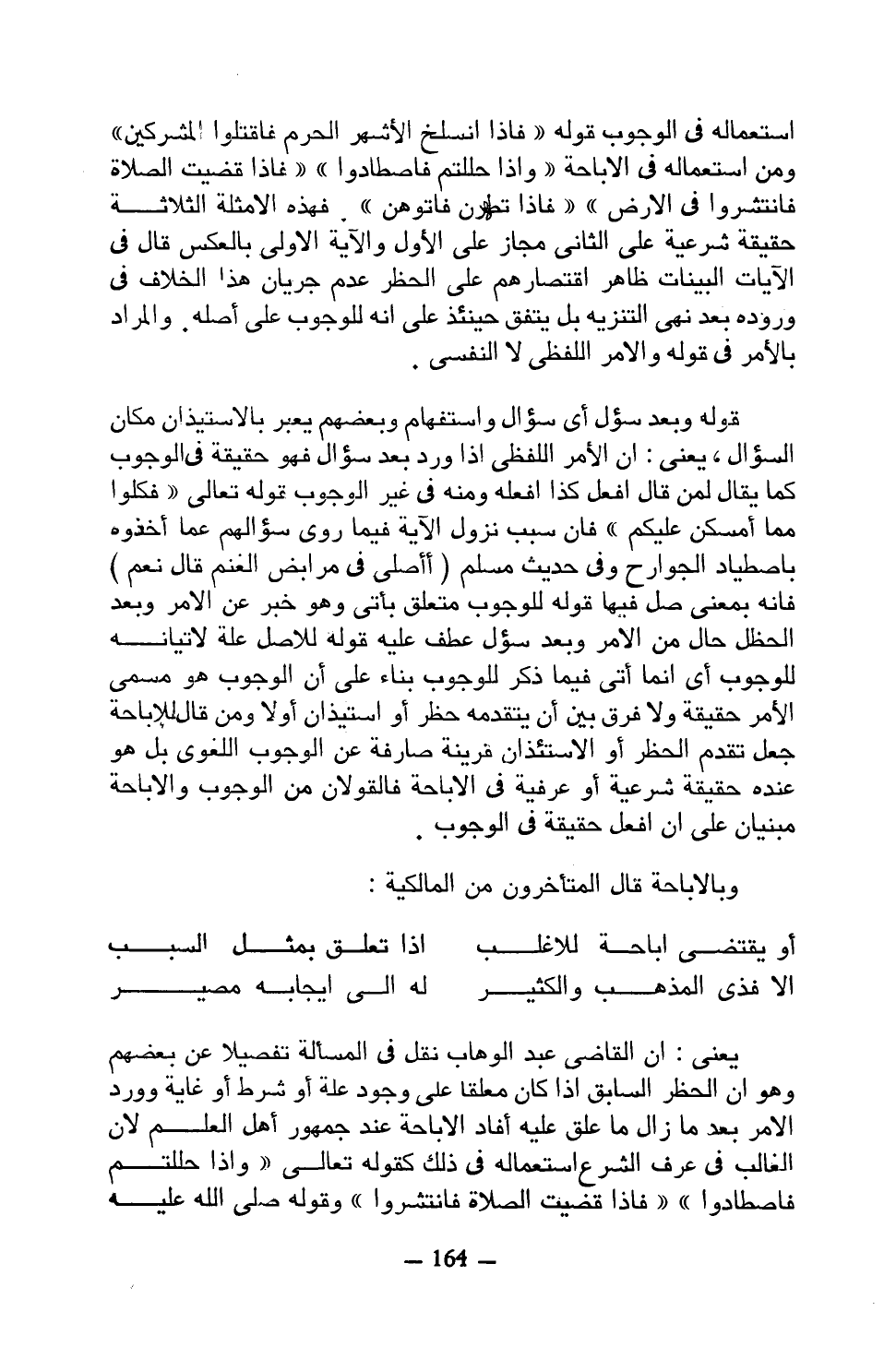 استعماله في الوجوب قوله ((فإذا انسلخ الأشهر الحرم فاقتلوا المشركين)) ومن استعماله في الإباحة ((وإذا حللتم فاصطادوا)) ((فإذا قضيت الصلاة فانتشروا في الأرض)) ((فإذا تطهرن فأتوهن)) فهذه الأمثلة الثلاثة حقيقة شرعية على الثاني مجاز على الأول والآية الأولى بالعكس قال في الآيات البينات ظاهر اقتصارهم على الخطر عدم جريان هذا الإخلاف في وروده بعد نهي التنزيه بل يتفق حينئذ على أنه للوجوب على أصله. والمراد بالأمر في وقله والأمر اللفظي لا النفسي.