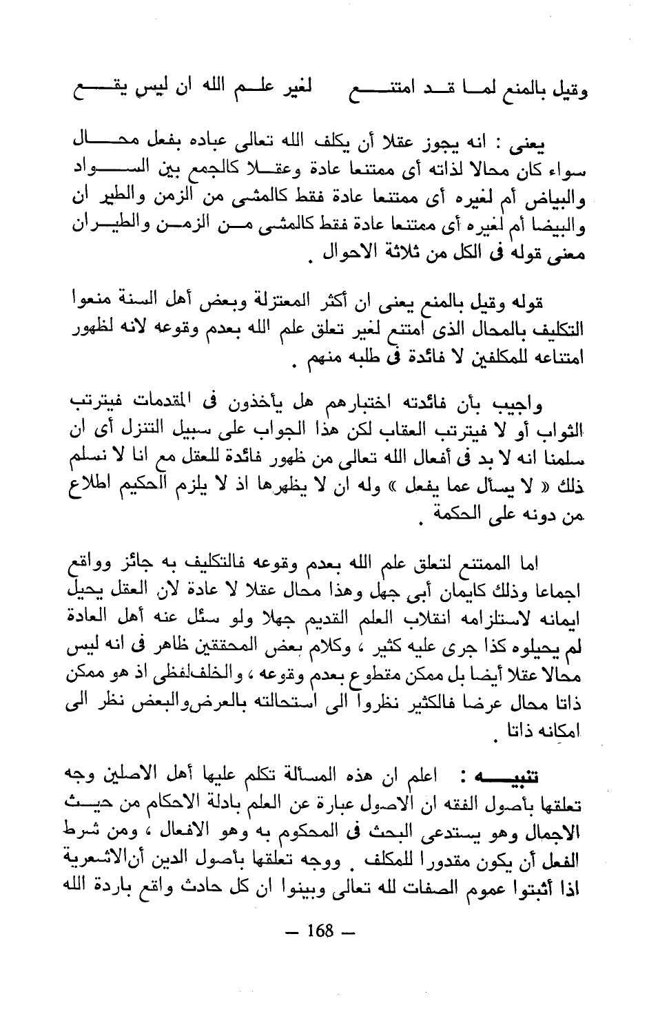 يعني: أنه يجوز عقلا أن يكلف الله تعالى عباده بفعل محال سواء كان محالا لذاته أي ممتنعا عادة وعقلا كالجمع بين السواد والبياض أم لغيره أي ممتنعا عادة فقط كالمشي من الزمن والطيران والبيضا أم لغيره أي ممتنعا عادة فقط كالمشي من الزمن والطيران معنى قوله في الكل من ثلاثة الأحوال.