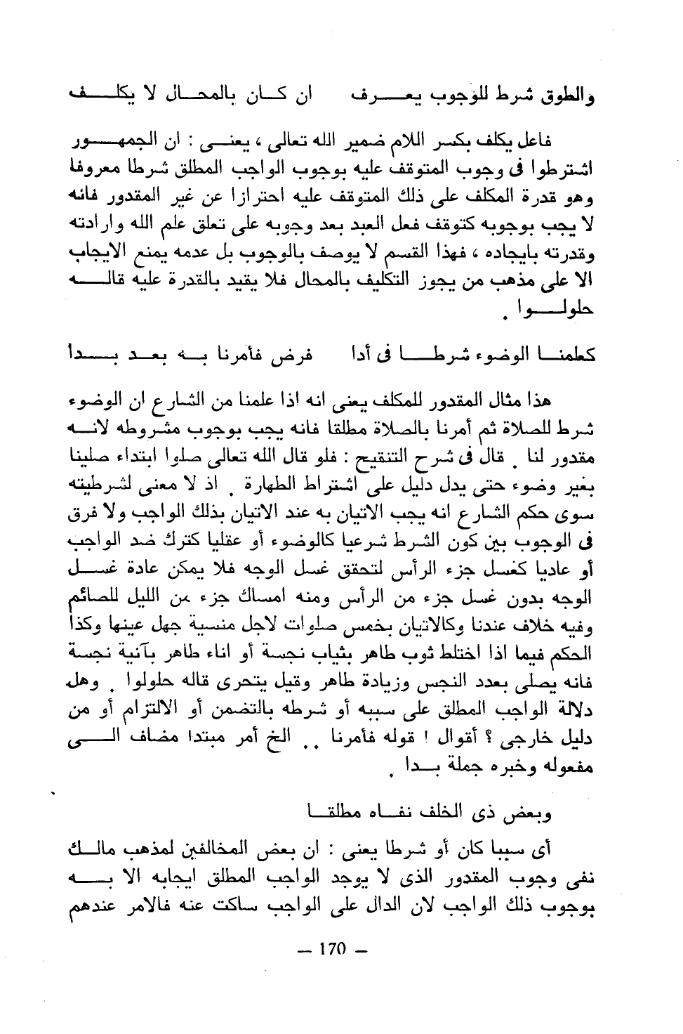 فاعل يكلف بكسر اللام ضمير الله تعالى, يعني: أن الجمهور اشترطوا في وجوب المتوقف عليه بوجوب الواجب المطلق شرطا معروفا وهو قدرة المكلف على ذلك المتوقف عليه احترازا عن غير المقدور فأنه لا يجب بوجوبه كتوقف فعل العبد بعد وجوبه على تعلق علم الله وإرادته وقدرته بإيجاده, فهذا القسم لا يوصف بالوجوب بل عدمه يمنع الإيجاب إلا على مذهب من يجوز التكليف بالمحال فلا يقيد بالقدرة عليه قاله حلولوا.