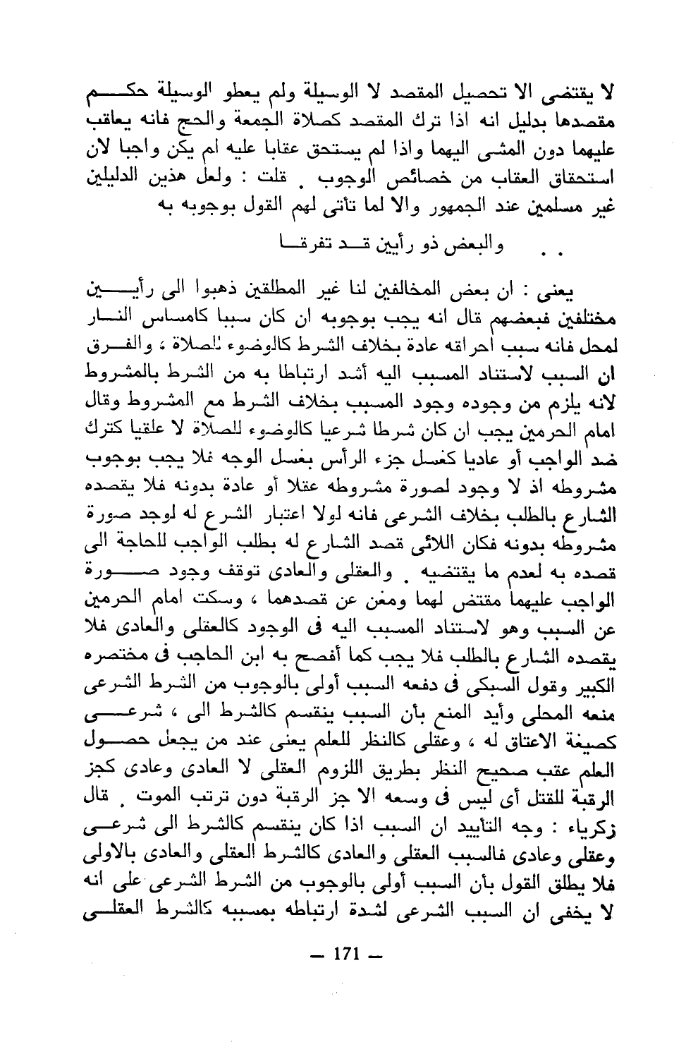 يعني: أن بعض المخالفين لنا غير المطلقين ذهبوا إلى رأيين مختلفين فبعضهم قال أنه يجب بوجوبه إن كان سببا كمساس النار لمحل فإنه سبب إحراقه عادة بخلاف الشرط كالوضوء للصلاة, والفرق أن السبب لاستناد المسبب إليه أشد ارتباطا به من الشرط بالمشروط لأنه يلزم من وجوده وجود المسبب بخلاف الشرط مع المشروط وقال إمام الحرمين يجب إن كان شرطا شرعيا كالوضوء للصلاة لا عقليا كترك ضد الواجب أو عاديا كغسل جزء الرأس بغسل الوجه فلا يجب بوجوب مشروطة إذ لا وجود لصورة مشروطة عقلا أو عادة بدونه فلا يقصده الشارع بالطلب بخلاف الشرعي فإنه لولا اعتبار الشرع له لوجد صورة مشروطة بدونه فكان اللائي قصد الشارع له بطلب الواجب للحاجة إلى قصده به لعدم ما يقتضيه. والعقلي والعادي توقف وجود صورة الواجب عليهما مقتض لهما ومغن عن قصدهما, وسكت إمام الحرمين عن السبب وهو لاستناد المسبب إليه في الوجود كالعقلي والعادي فلا يقصده الشارع بالطلب فلا يجب كما أفصح به ابن الحاجب في مختصره الكبير وقول السبكي في دفعه السبب أولى بالوجوب من الشرط الشرعي منعه المحلي وأيد المنع بأن السبب ينقسم كالشرط إلى, شرعي كصيغة الإعتاق له, وعقلي كالنظر للعلم يعني عند من يجعل حصول العلم عقب صحيح النظر بطريق اللزوم العقلي لا العادي وعادي كجزء الرقبة للقتل أي ليس في وسعه إلا جزء الرقبة دون ترتب الموت. قال زكريا: وجه التأييد أن السبب إذا كان ينقسم كالشرط إلي شرعي وعقلي وعادي فالسبب العقلي والعادي كالشرط العقلي والعادي بالأول فلا يطلق القول بأن السبب أولى بالوجوب من الشرط الشرعي على أنه لا يخفي أن السبب الشرعي لشدة ارتباطه بمسببه كالشرط العقلي