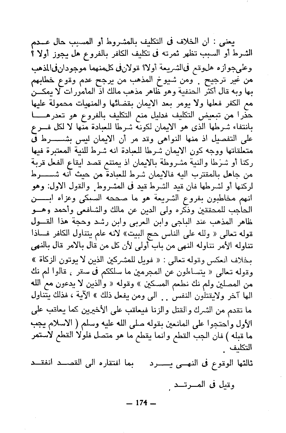 يعني: أن الخلاف في التكليف بالمشروط أو المسبب حال عدم الشرط أو السبب تظهر ثمرته في تكليف الكافر بالفروع هل يجوز أولا؟ وعلى جوازه هل وقع في الشريعة أولا؟ قولان في كل منهما موجودان في المذهب من غير ترجيح. ومن شيوخ المذهب من يرجح عدم وقوع خطابهم بها وبه قال أكثر الحنفية وهو ظاهر مذهب مالك إذ المأمورات لا يمكن مع الكفر فعلها ولا يؤمر بعد الإيمان بقضائها والمنهيات محمولة عليها حذرا من تبعيض التكليف فدليل منع التكليف بالفروع هو تعذرها بانتفاء شرطها الذي هو الإيمان لكونه شرطا للعبادة منها لا لكل فرع على التفصيل إذ منها النواهي وقد مر أن الإيمان ليس بشرط في متعلقاتها ووجه كون الإيمان شرطا للعبادة أنه شرط للنية المعتبرة فيها ركنا أو شرطا والنية مشروطة بالإيمان إذ يمتنع قصد ايقاع الفعل قربة من جاهل بالمقترب إليه فالإيمان شرط للعبادة من حيث أنه شرط لركنها أو لشرطها فإن قيد الشرط قيد في المشروط. والقول الأول: وهو أنهم مخاطبون بفروع الشريعة هو ما صححه السبكي وعزاه ابن الحاجب للمحققين وذكره ولي الدين عن مالك والشافعي وأحمد وهو ظاهر المذهب عند الباجي وابن العربي وابن رشد وحجة هذا القول قوله تعالى ((وله على الناس حج البيت)) لأنه عام يتناول الكافر فإذا تناوله الأمر تناوله النهي من باب أولى لأن كل من قال بالأمر قال بالنهي بخلاف العكس وقوله تعالى: ((فويل للمشركين الذين لا يؤتون الزكاة)) وقوله تعالى ((يتساءلون عن المجرمين ما سلككم في سقر، قالوا لم نك من المصلين ولم نك نطعم المسكين)) وقوله ((والذين لا يدعون مع الله إلها آخر ولا يقتلون النفس .. إلى ومن يفعل ذلك)) الآية، فذلك يتناول ما تقدم من الشرك والقتل والزنا فيعاقب على الأخيرين كما يعاقب على الأول واحتجوا على المانعين بقوله صلى الله عليه وسلم (الإسلام يجب ما قبله) فإن الجب القطع وإنما يقطع ما هو متصل فلولا القطع لاستمر التكليف.
