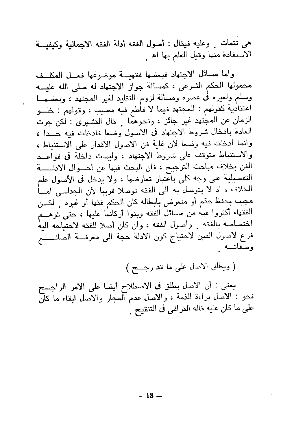 وأما مسائل الاجتهاد فبعضها فقهية موضوعها فعل المكلف محمولها الحكم الشرعي، كمسألة جواز الاجتهاد له صلى الله عليه وسلم ولغيره في عصره ومسألة لزوم التقليد لغير المجتهد، وبعضها اعتقاديه كقولهم: المجتهد فيما لا قاطع فيه مصيب، وقولهم: خلو الزمان عن المجتهد غير جائز، ونحوهما. قال القشيري: لكن جرت العادة بإدخال شروط الاجتهاد في الأصول وضعا فأدخلت فيه حدًا، وإنما أدخلت فيه وضعًا لأن غاية فن الأصول الإقدار عل الاستنباط، والاستنباط متوقف على شروط الاجتهاد، وليست داخلة في قواعد الفن بخلاف مباحث الترجيح، فإن البحث فيها عن أحوال الأدلة التفصيلية على وجه كلي باعتبار تعارضها، ولا يدخل في الأصول علم الخلاف، إذ لا يتوصل به إلى الفقه توصلًا قريبًا لأن الجدلي إما مجيب بحفظ حكم أو متعرض بإبطاله كان الحكم فقهًا أو غيره. لكن الفقهاء أكثروا فيه من مسائل الفقه وبنو أركانها عليها، حتى توهم اختصاصه بالفقه. وأصول الفقه، وإن كان أصلًا للفقه لاحتياجه إليه فرع لأصول الدين لاحتياج كون الأدلة حجة إلى معرفة الصانع وصفاته.