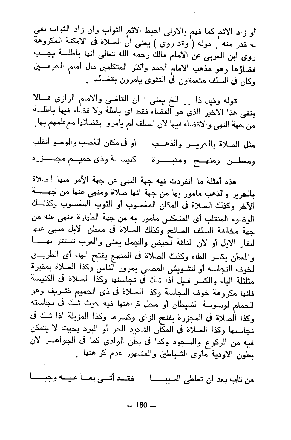 هذه أمثلة ما انفردت فيه جهة النهي عن جهة الأمر منها الصلاة بالحرير والذهب مأمور بها من جهة أنها صلاة ومنهي عنها من جهة الآخر وكذلك الصلاة في المكان المعصوب أو الثوب المغصوب وكذلك الوضوء المنقلب أي المنعكس مأمور به من جهة الطهارة منهي عنه من جهة مخالفة السلف الصالح وكذلك الصلاة في معطن الإبل منهي عنها لنفار الإبل أو لأن الناقة تحيض والجمل يمني والعرب تستتر بها والمعطن بكسر الطاء وكذلك الصلاة في المنهج بفتح الهاء أي الطريق لخوف النجاسة أو لتشويش المصلي بمرور الناس وكذا الصلاة بمقبرة مثلثلة الباء والكسر قليل إذا شك في نجاستها وكذا الصلاة في الكنيسة فأنها مكروهة خوف النجاسة وكذا الصلاة في ذي الحميم كشريف وهو الحمام لوسوسة الشيطان أو محل كراهتها فيه حيث شك في نجاسته وكذا الصلاة في المكان الشديد الحر أو البرد بحيث لا يتمكن فيه من الركوع والسجود وكذا في بطن الوادي كما في الجواهر لأن بطون الأودية مأوى الشياطين والمشهور عدم كراهتها.