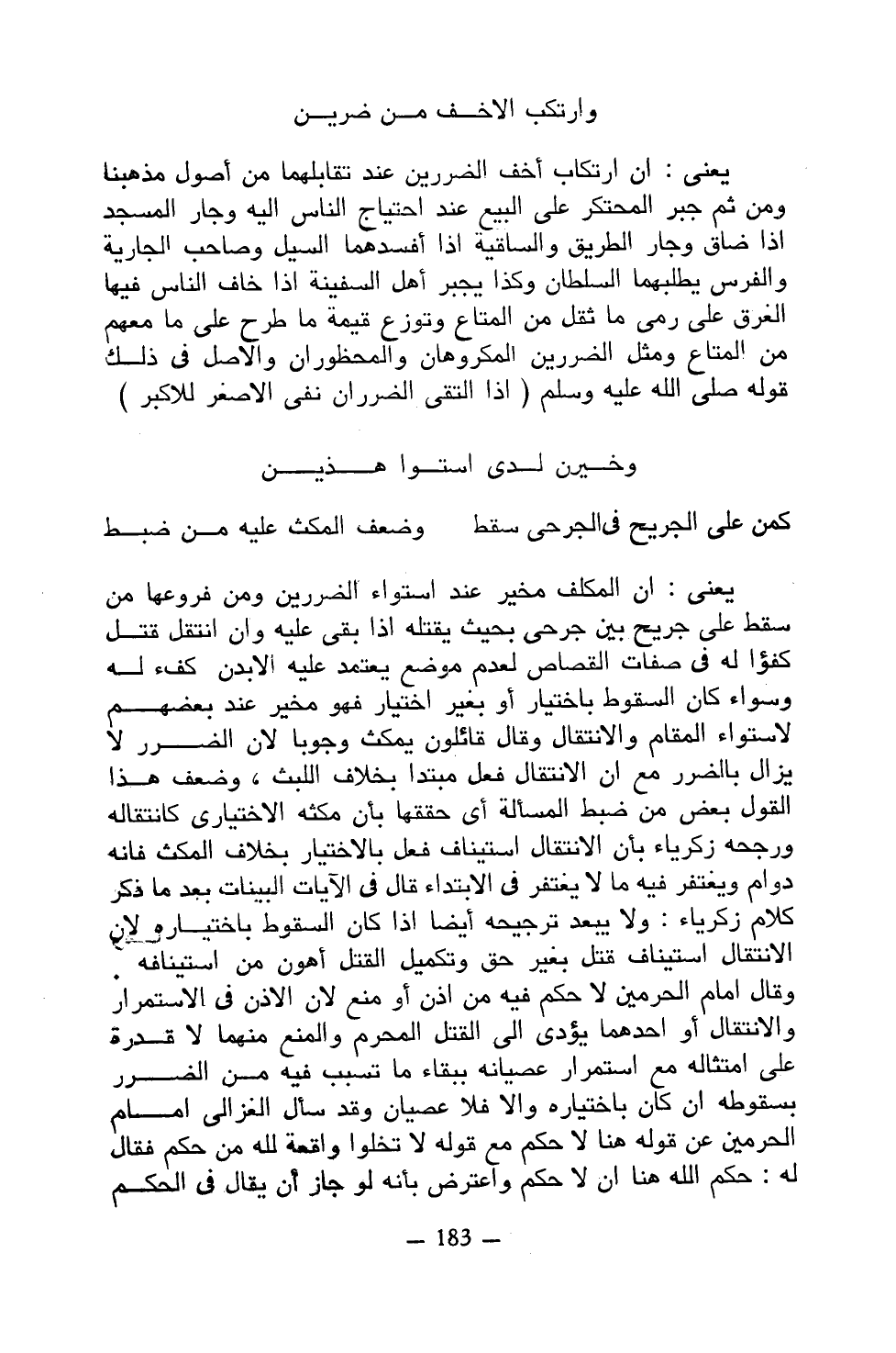 يعني: إن ارتكاب أخف الضررين عند تقابلهما من أصول مذهبنا ومن ثم جبر المحتكر على البيع عند احتياج الناس إليه وجار المسجد إذا ضاق وجار الطريق والساقية إذا أفسدهما السيل وصاحب الجارية والفرس يطلبهما السلطان وكذا يجبر أهل السفينة إذا خاف الناس فيها الغرق على رمي ما ثقل من المتاع وتوزع قيمة ما طرح على ما معهم من المتاع ومثل الضررين المكروهان والمحظوران والأصل في ذلك قوله صلى الله عليه وسلم (إذا التقى الضرران نفى الأصغر للأكبر)