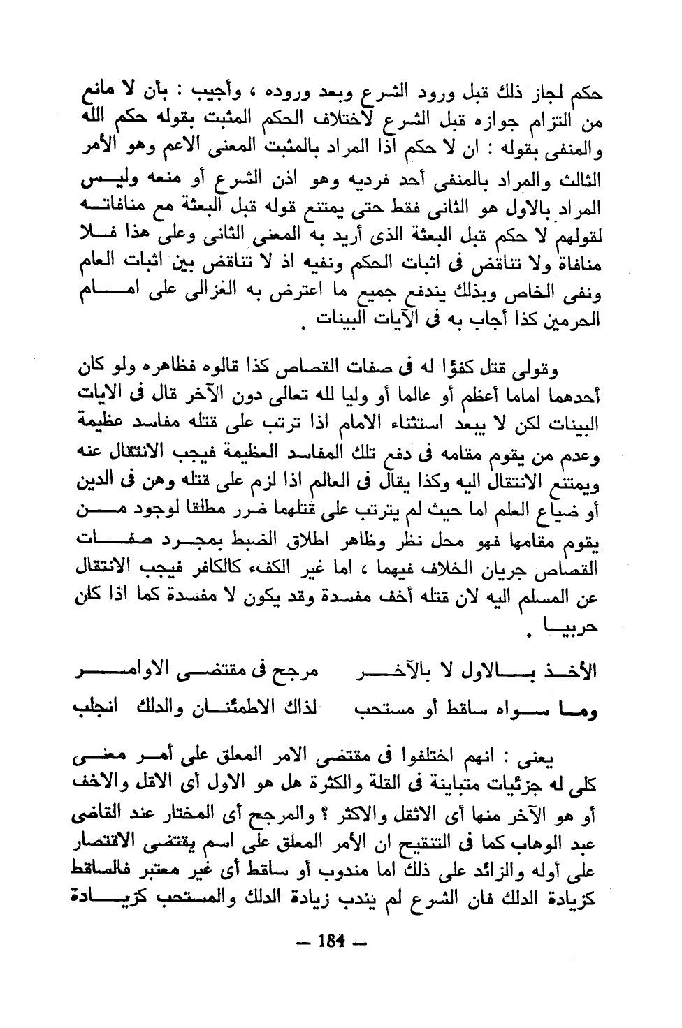 حكم لجاز ذلك قبل ورود الشرع وبعد وروده, وأجيب: بأن لا مانع من التزام جوازه قبل الشرع لاختلاف الحكم المثبت بقوله حكم الله والمنفي بقوله: أن لا حكم إذا المراد بالمثبت المعنى الأعم وهو الأمر الثالث والمراد بالمنفي أحد فرديه وهو إذن الشرع أو منعه وليس المراد بالأول هو الثاني فقط حتى يمتنع قوله قبل البعثة مع منافاته لقولهم لا حكم قبل البعثة الذي أريد به المعنى الثاني وعلى هذا فلا منافاة ولا تناقض في اثبات الحكم ونفيه إذ لا تناقض بين إثبات العام ونفي الخاص وبذلك يندفع جميع ما أعترض به الغزالي على إمام الحرمين كذا أجاب به في الآيات البينات.