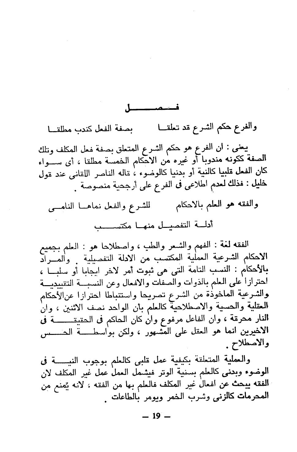الفقه لغة: الفهم والشعر والطب، واصطلاحًا هو: العلم بجميع الأحكام الشرعية العملية المكتسب من الأدلة التفصيلية. والمراد بالأحكام: النسب التامة التي هي ثبوت أمر لأخر إيجابًا أو سلبًا، احترازًا على العلم بالذوات والصفات والأفعال وعن النسبة التقييدية والشرعية المأخوذة من الشرع تصريحًا واستنباطًا احترازًا عن الأحكام العقلية والحسية والاصطلاحية كالعلم بأن الواحد نصف الاثنين، وإن النار محرقة، وإن الفاعل مرفوع وإن كان الحاكم في الحقيقة في الأخيرين إنما هو العقل على المشهور، ولكن بواسطة الحس والاصطلاح.