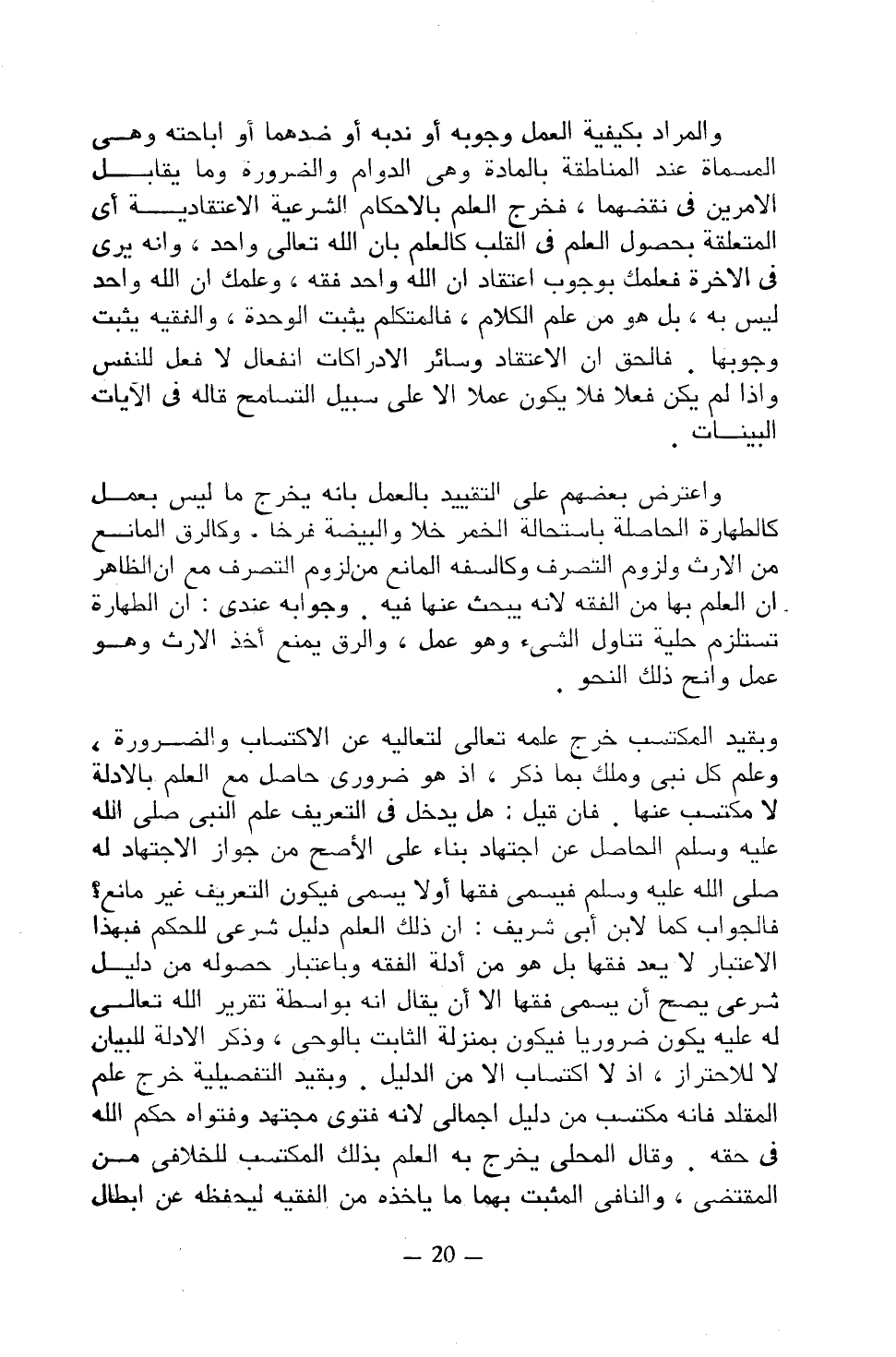 والمراد بكيفية العمل وجوبه أو ندبه أو ضدهما أو إباحته وهي المسماة عن المناطقة بالمادة وهي الدوام والضرورة وما يقابل الأمرين في نقضهما، فخرج العلم بالأحكام الشرعية الاعتقادية أي المتعلقة بحصول العلم في القلب كالعلم بأن الله تعالى واحد، وأنه يرى في الآخرة فعلمك بوجوب اعتقاد أن الله واحد فقه، وعلمك أن الله واحد ليس به، بل هو من علم الكلام، فالمتكلم يثبت الوحدة، والفقيه يثبت وجوبها. فالحق أن الاعتقاد وسائر الإدراكات انفعال لا فعل للنفس وإذا لم يكن فعلا فلا يكون عملًا إلا على سبيل التسامح قاله في الآيات البينات.