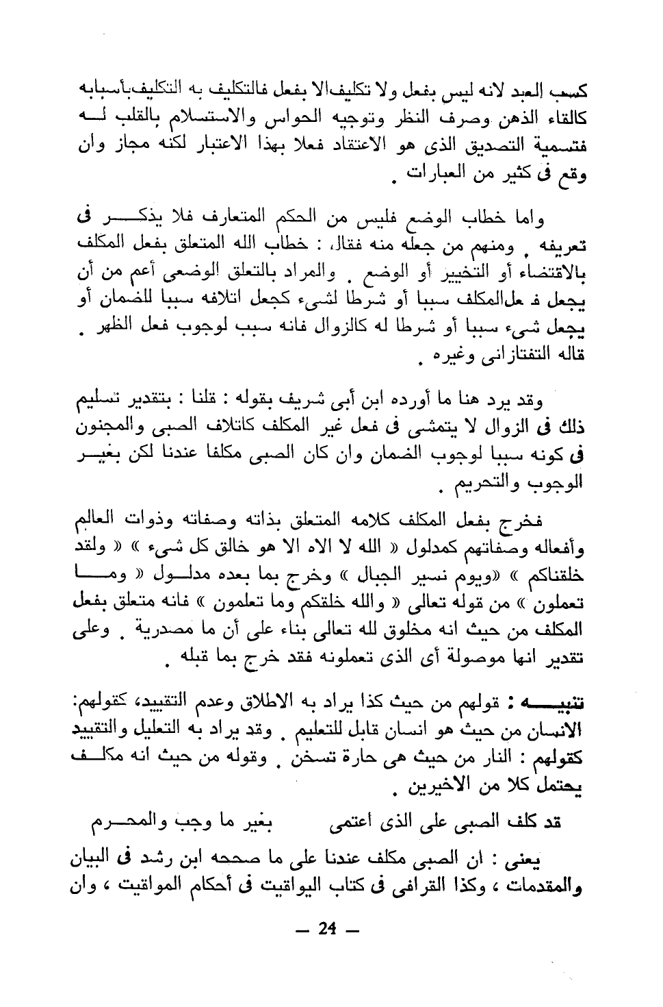 تنبيه: قولهم من حيث كذا يراد به الإطلاق وعدم التقييد، كقولهم: الإنسان من حيث هو إنسان قابل للتعليم. وقد يراد التعليل والتقييد كقولهم: النار من حيث هي حارة تسخن. وقوله من حيث أنه مكلف يحتمل كلا من الأخيرين.