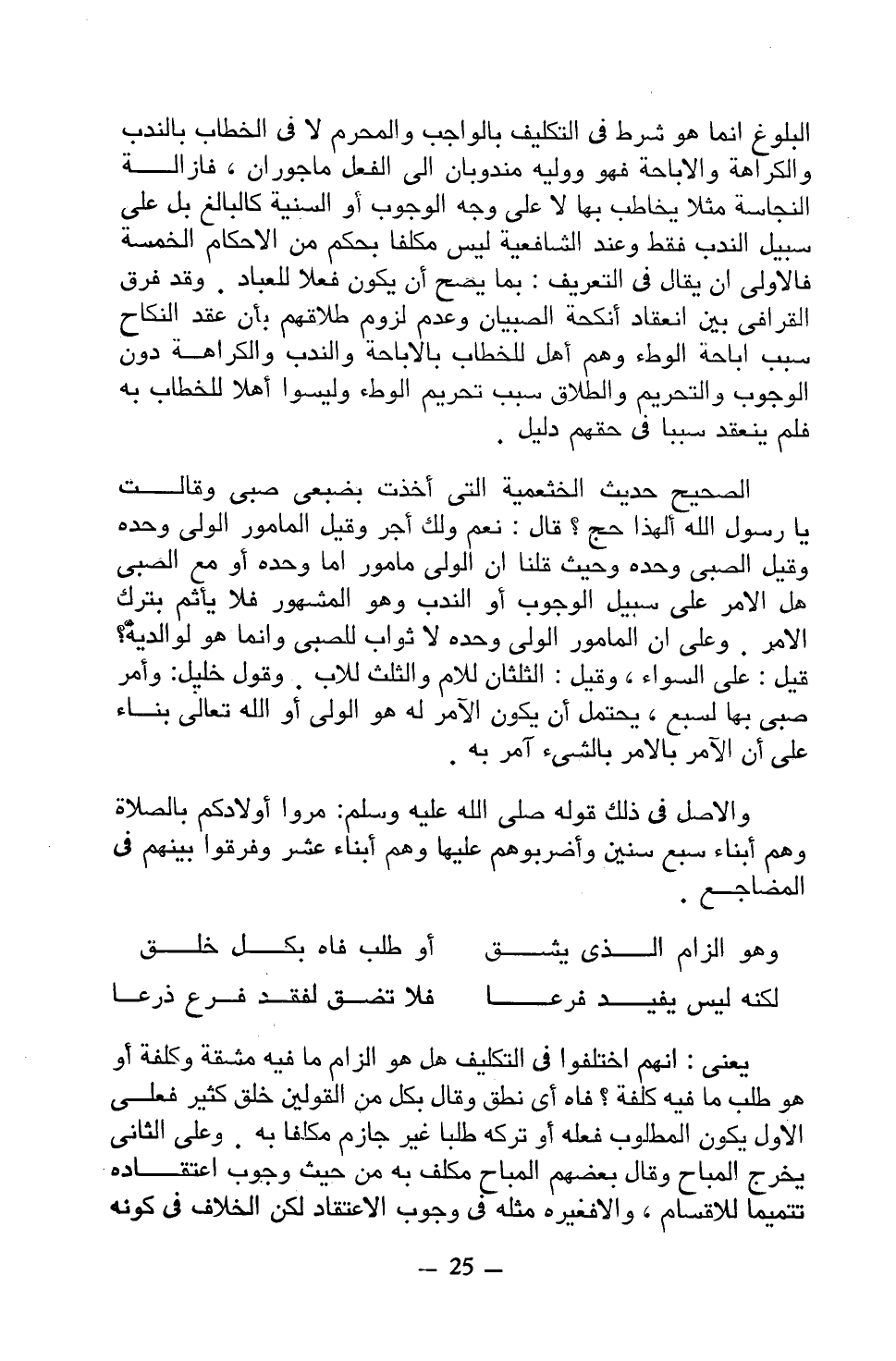 البلوغ إنما هو شرط في التكليف بالواجب والمحرم لا في الخطاب بالندب والكراهة والإباحة فهو ووليه مندوبان إلى الفعل مأجوران، فإزالة النجاسة مثلًا يخاطب بها لا على وجه الوجوب أو السنية كالبالغ بل على سبيل الندب فقط وعند الشافعية ليس مكلفًا بحكم من الأحكام الخمسة فالأولى أن يقال في التعريف: بما يصح أن يكون فعلًا للعباد. وقد فرق القرافي بين انعقاد أنكحة الصبيان وعدم لزوم طلاقهم بأن عقد النكاح سبب إباحة الوطء وهم أهل للخطاب بالإباحة والندب والكراهة دون الوجوب والتحريم والطلاق سبب تحريم الوطء وليسوا أهلًا للخطاب به فلم ينعقد سببًا في حقهم دليل.