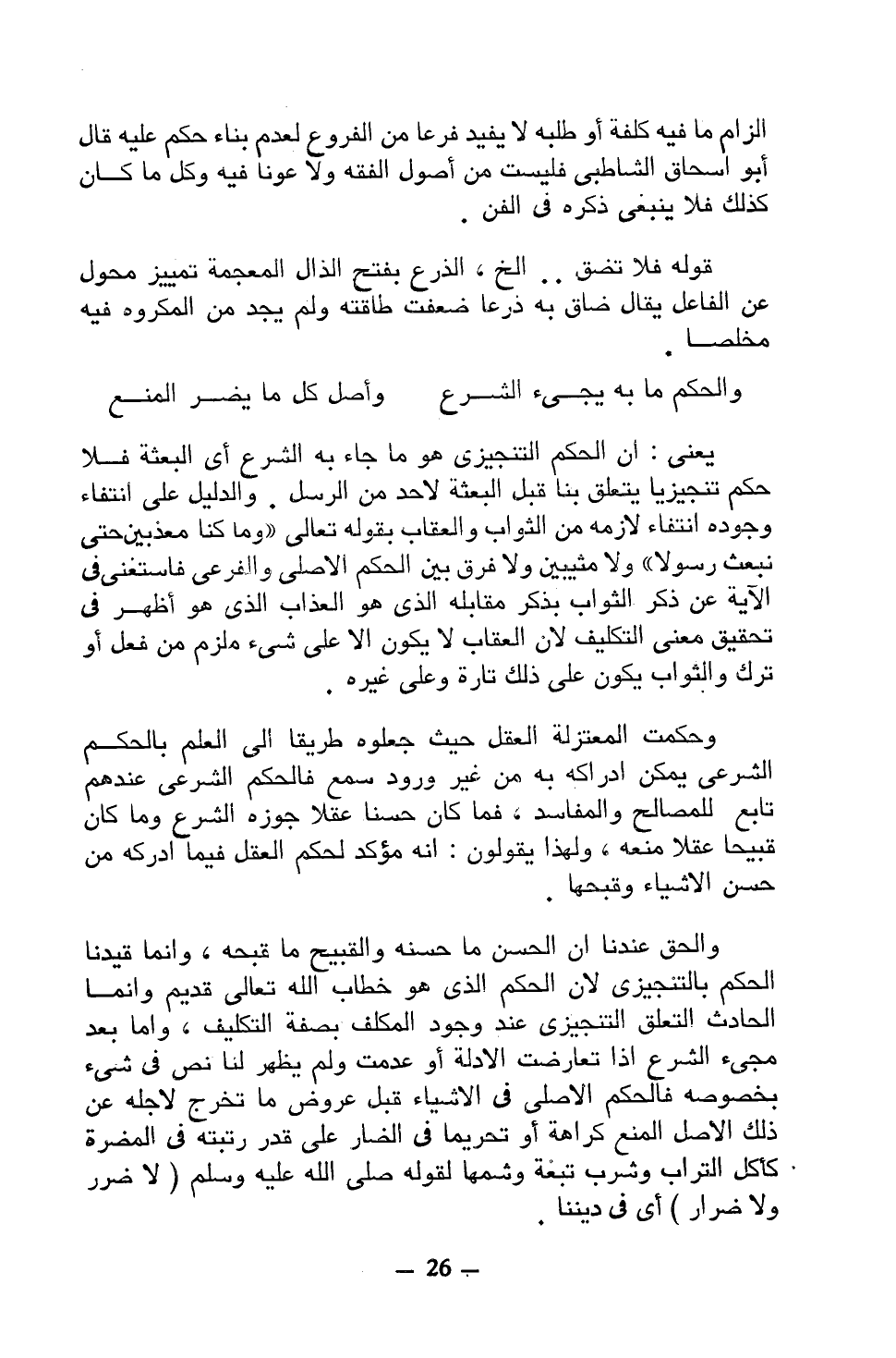 والحق عندنا أن الحسن ما حسنه والقبيح ما قبحه، وإنما قيدنا الحكم بالتنجيزي لأن الحكم الذي هو خطاب الله تعالى قديم وإنما الحادث التعلق التنجيزي عند وجود المكلف بصفة التكليف، وأما بعد مجيء الشرع إذا تعارضت الأدلة أو عدمت ولم يظهر لنا نص في شيء بخصوصه فالحكم الأصلي في الأشياء قبل عروض ما تخرج لأجله عن ذلك الأصل المنع كراهة أو تحريمًا في الضار على قدر رتبته في المضرة كأكل التراب وشرب تبعة وشمها لقوله صلى الله عليه وسلم (لا ضرر ولا ضرار) أي في ديننا.