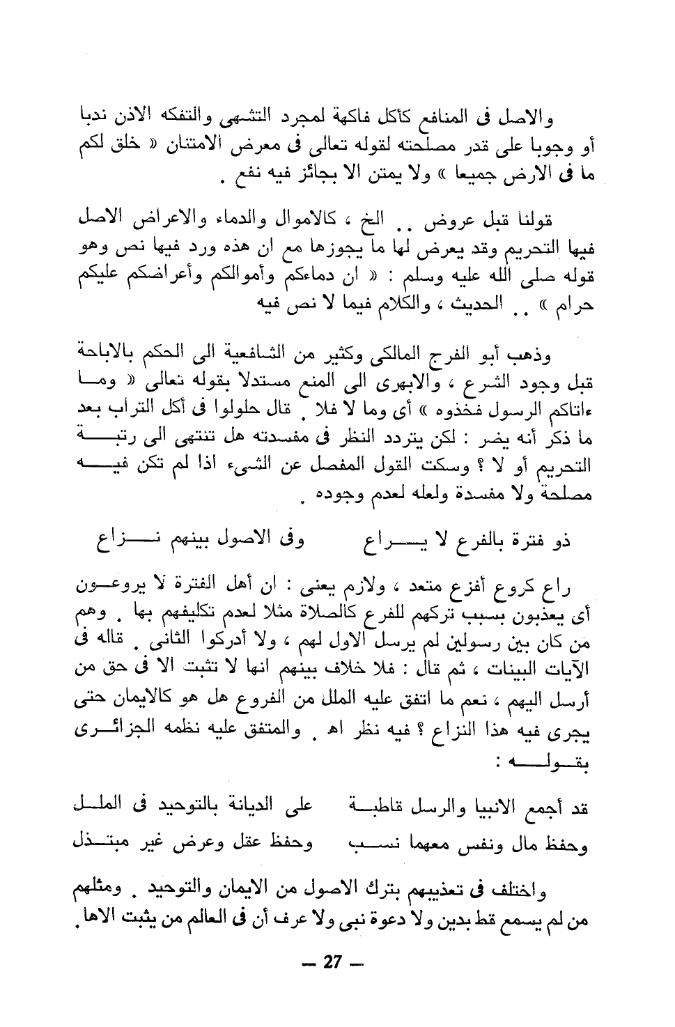 وذهب أبو الفرج المالكي وكثير من الشافعية إلى الحكم بالإباحة قبل وجود الشرع، والأبهري إلى المنع مستدلًا بقوله تعالى ((وما ءاتاكم الرسول فخذوه)) أي وما لا فلا. قال حلولوا في أكل التراب بعد ما ذكر أنه يضر: لكن يتردد النظر في مفسدته هل تنتهي إلى رتبة التحريم أو لا؟ وسكت القول المفصل عن الشيء إذا لم تكن فيه مصلحة ولا مفسدة ولعله لعدم وجوده.