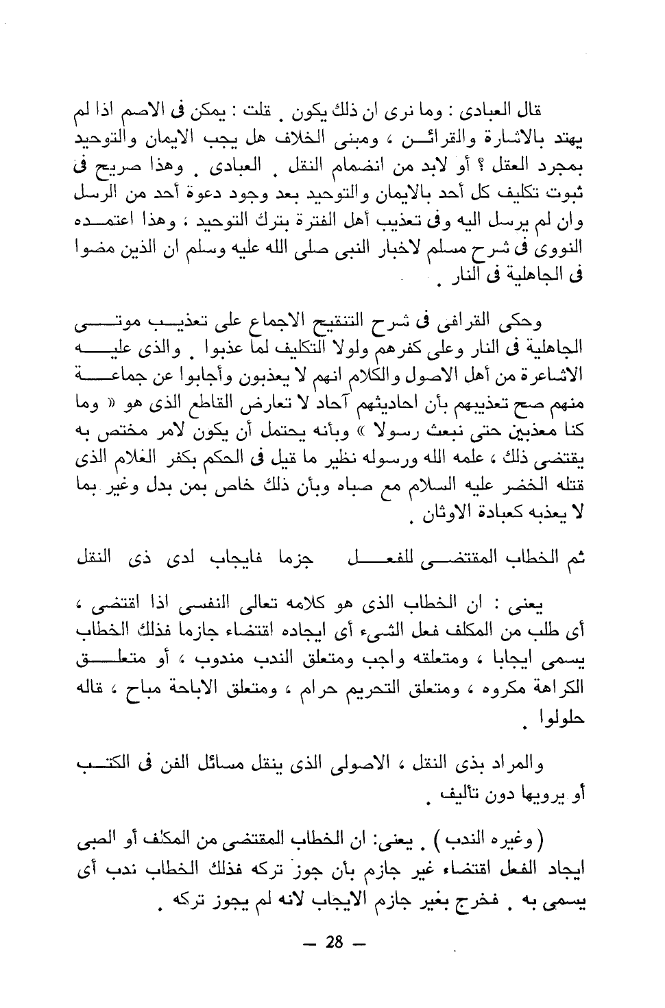 وحكى القرافي في شرح التنقيح الإجماع على تعذيب موتى الجاهلية في النار وعلى كفرهم ولولا التكليف لما عذبوا. والذي عليه الأشاعرة من أهل الأصول والكلام أنهم لا يعذبون وأجابوا عن جماعة منهم صح تعذيبهم بأن أحاديثهم آحاد لا تعارض القاطع الذي هو ((وما كنا معذبين حتى نبعث رسولًا)) وبأنه يحتمل أن يكون لأمر مختص به يقتضي ذلك، علمه الله ورسوله نظير ما قيل في الحكم بكفر الغلام الذي قتله الخضر عليه السلام مع صباه وبأن ذلك خاص بمن بدل وغير بما لا يعذبه كعبادة الأوثان.