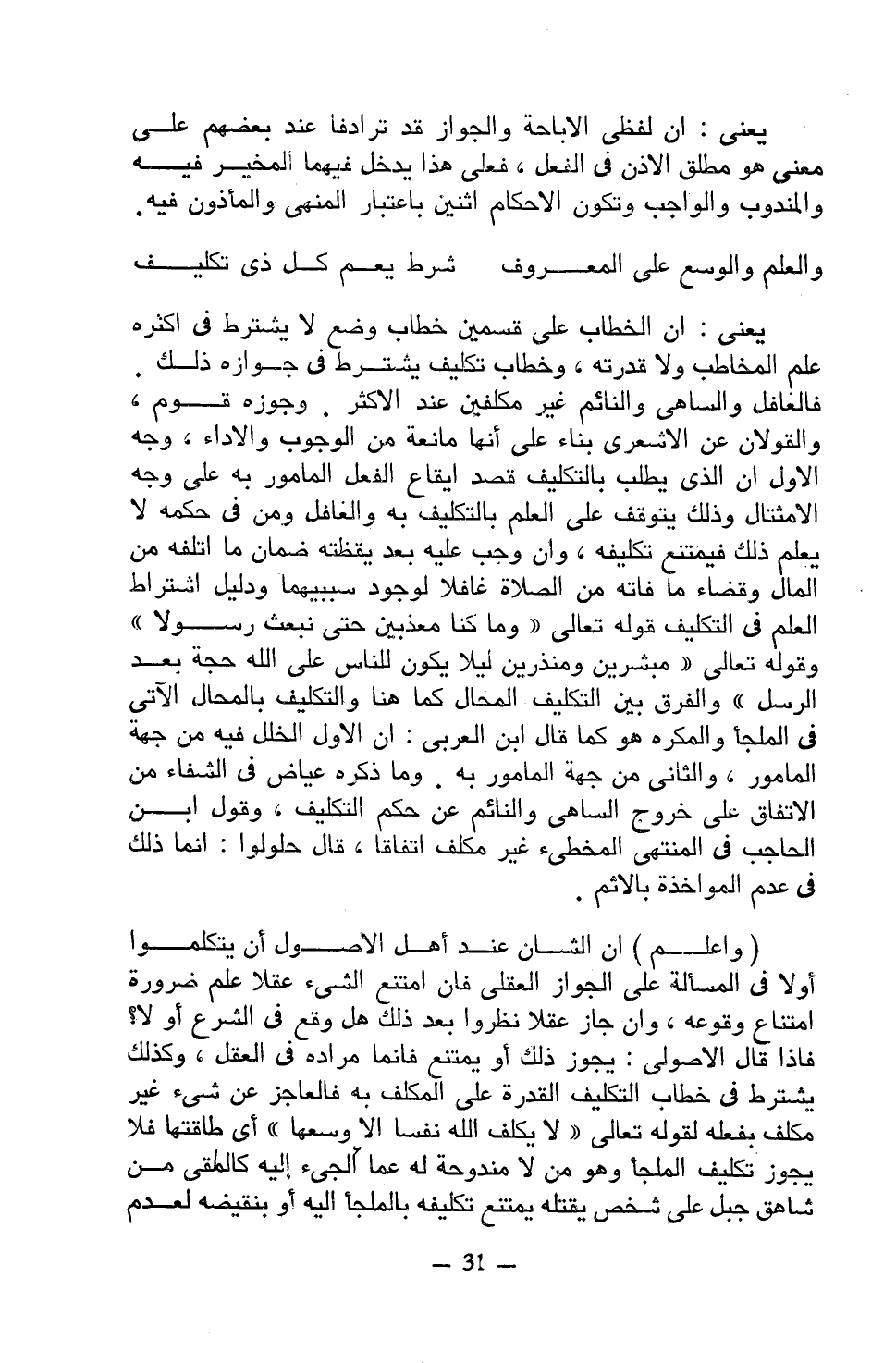 (واعلم) إن الشأن عند أهل الأصول أن يتكلموا أولًا في المسألة على الجواز العقلي فإن امتنع الشيء عقلًا علم ضرورة امتناع وقوعه، وإن جاز عقلًا نظروا بعد ذلك هل وقع في الشرع أو لا؟ فإذا قال في الأصولي: يجوز ذلك أو يمتنع فإنما مراده في العقل، وكذلك يشترط في خطاب التكليف القدرة على المكلف به فالعاجز عن شيء غير مكلف بفعله لقوله تعالى ((لا يكلف الله نفسًا إلى وسعها)) أي طاقتها فلا يجوز تكليف الملجأ وهو من لا مندوحة له عما ألجئ إليه كالملقى من شاهق جبل على شخص يقتله يمتنع تكليفه بالملجأ إليه أو بنقيضه لعدم