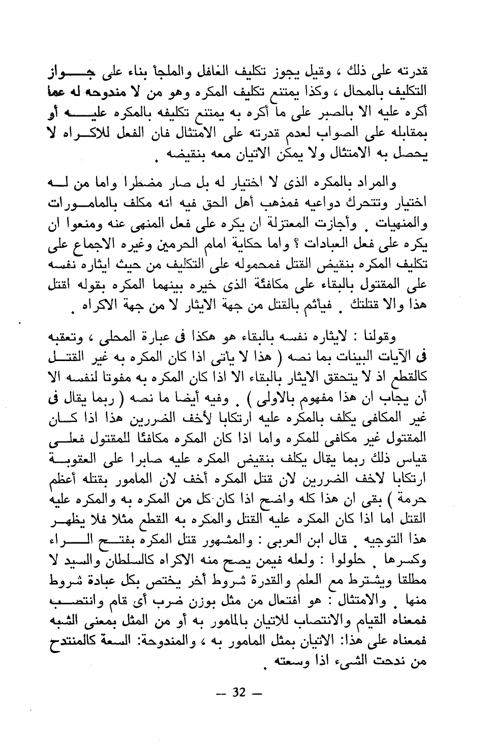 وقولنا: لإيثاره نفسه بالبقاء هو هكذا في عبارة المحلي، وتعقبه في الآيات البينات بما نصه (هذا لا يأتي إذا كان المكره به غير القتل كالقطع إذ لا يتحقق الإيثار بالبقاء إلا إذا كان المكره به مفوتًا لنفسه إلا أن يجاب إن هذا مفهوم بالأولى). وفيه أيضًا ما نصه (ربما يقال في غير المكافي يكلف بالمكره عليه ارتكابًا لأخف الضررين هذا إذا كان المقتول غير مكافي للمكره وإما إذا كان المكره مكافئًا للمقتول فعلى قياس ذلك ربما يقال يكلف بنقيض المكره عليه صابرًا على العقوبة ارتكابًا لأخف الضررين لأن قتل المكره أخف لأن المأمور بقتله أعظم حرمة) بقى إن هذا كله واضح إذا كان كل من المكره به والمكره عليه القتل إما إذا كان المكره عليه القتل والمكره به القطع مثلًا فلا يظهر هذا التوجيه. قال ابن العربي: والمشهور قتل المكره بفتح الراء وكسرها. حلولوا: ولعله فيمن يصح منه الإكراه كالسلطان والسيد لا مطلقًا ويشترط مع العلم والقدرة شروط أخرى يختص بكل عبادة شروط منها. والامتثال: هو افتعال من مثل بوزن ضرب أي قام وانتصب فمعناه القيام والانتصاب للإتيان بالمأمور به أو من المثل بمعنى الشبه فمعناه على هذا: الإتيان بمثل المأمور به، والمندوحة: السعة كالمنتدح من ندحت الشيء إذا وسعته.