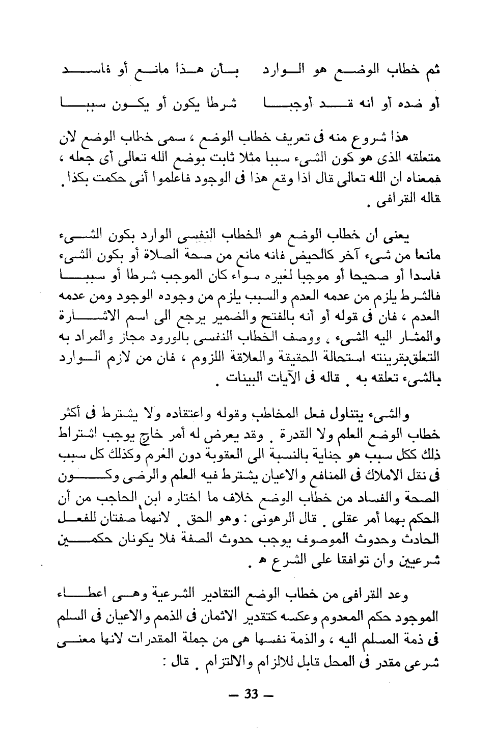 هذا شروع منه في تعريف خطاب الوضع، سمي خطاب الوضع لأن متعلقه الذي هو كون الشيء سببًا مثلًا ثابت بوضع الله تعالى أي جعله، فمعناه أن الله تعالى قال إذا وقع هذا في الوجود فاعلموا أني حكمت بكذا. قال القرافي.