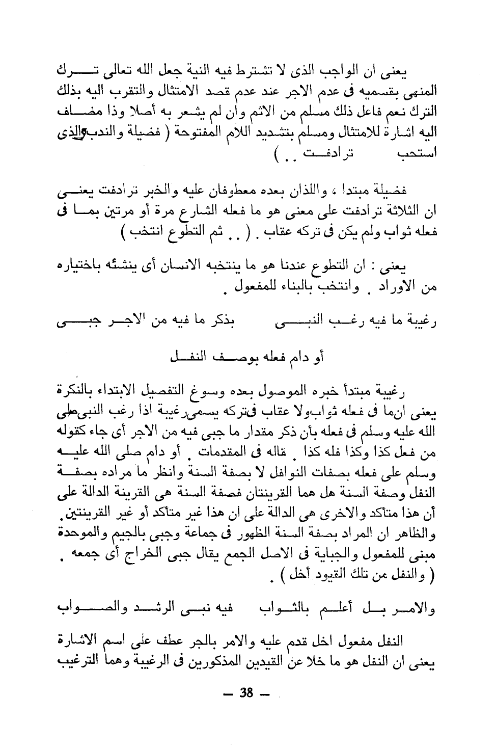 يعني أن الواجب الذي لا تشرط فيه النية جعل الله تعالى ترك المنهي بقسميه في عدم الأجر عند عدم قصد الامتثال والتقرب إليه بذلك الترك نعم فاعل ذلك مسلم من الإثم وإن لم يشعر به أصلًا وذا مضاف إليه إشارة للامتثال ومسلم بتشديد اللام المفتوحة (فضيلة والندب والذي استحب ترادفت .. )