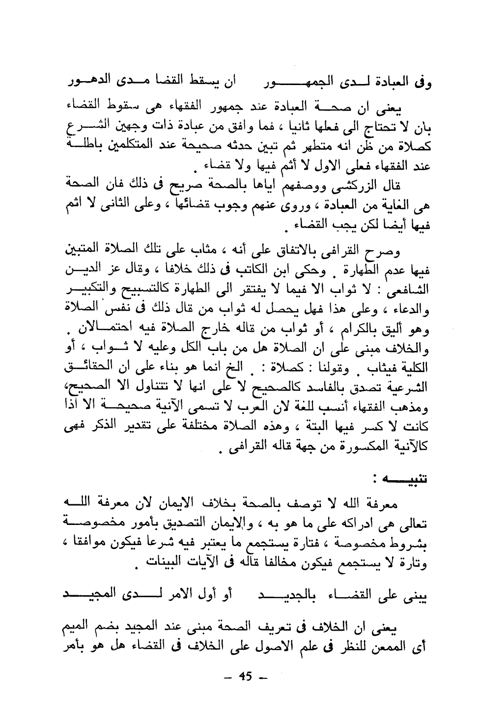 وصرح القرافي بالاتفاق على أنه، مثاب على تلك الصلاة المتبين فيها عدم الطهارة. وحكى ابن الكاتب في ذلك خلافًا، وقال عز الدين الشافعي: لا ثواب إلا فيما لا يفتقر إلى الطهارة كالتسبيح والتكبير والدعاء، وعلى هذا فهل يحصل له ثواب من قال ذلك في نفس الصلاة وهو أليق بالكرام، أو ثواب من قاله خارج الصلاة فيه احتمالان. والخلاف مبني على أن الصلاة هل من باب الكل وعليه لا ثواب، أو الكلية فيثاب. وقولنا: كصلاة: الخ إنما هو بناء على أن الحقائق الشرعية تصدق بالفاسد كالصحيح لا على أنها لا تتناول إلا الصحيح، ومذهب الفقهاء أنسب للغة لأن العرب لا تسمى الآنية صحيحة إلا إذا كانت لا كسر فيها البتة، وهذه الصلاة مختلفة على تقدير الذكر فهي كالآنية المكسورة من جهة قاله القرافي.