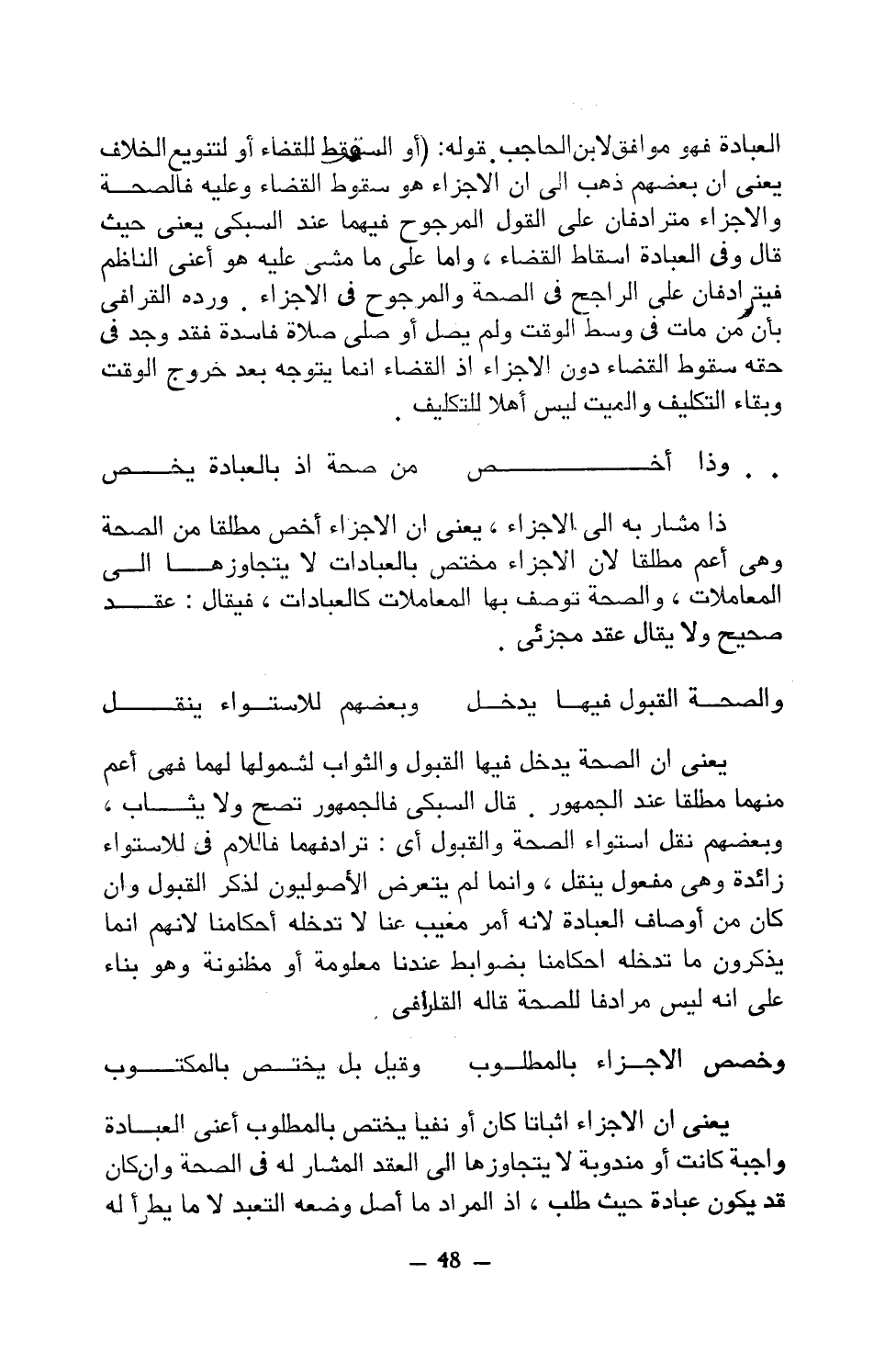 العبادة فهو موافق لابن الحاجب قوله: (أو السقوط للقضاء أو للتنويع الخلاف يعني بعضهم ذهب إلى أن الإجزاء هو سقوط القضاء عليه فالصحة والإجزاء مترادفان على القول المرجوح فيهما عند السبكي يعني حيث قال وفي العبادة إسقاط القضاء، وأما على ما مشى عليه هو أعني الناظم فيترادفان على الراجح في الصحة والمرجوح في الإجزاء. ورده القرافي بأن من مات في وسط الوقت ولم يصل أو صلى صلاة فاسدة فقد وجد في حقه سقوط القضاء دون الإجزاء إذ القضاء إنما يتوجه بعد خروج الوقت وبقاء التكليف والميت ليس أهلًا للتكليف.