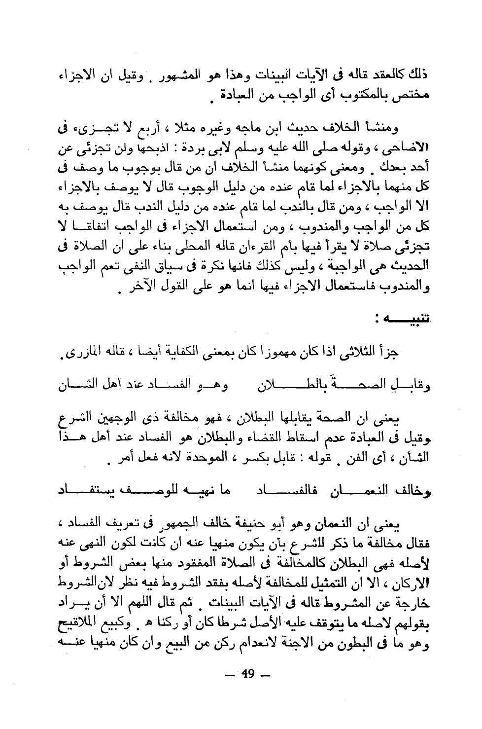 ومنشأ الخلاف حديث ابن ماجه وغيره مثلًا، أربع لا تجزئ في الأضاحي، وقوله صلى الله عليه وسلم لأبي بردة: اذبحها ولن تجزئي عن أحد بعدك. ومعنى كونهما منشأ الخلاف أن من قال بوجوب ما وصف في كل منهما بالإجزاء لما قام عنده من دليل الوجوب قال لا يوصف بالإجزاء إلا الواجب، ومن قال بالندب لما قام عنده من دليل الندب قال يوصف به كل من الواجب والمندوب، ومن استعمال الإجزاء في الواجب اتفاقًا لا تجزئي صلاة لا يقرأ فيها بأم القرءان قاله المحلي بناء على أن الصلاة في الحديث هي الواجبة، وليس كذلك فإنها نكرة في سياق النفي تعم الواجب والمندوب فاستعمال الإجزاء فيها إنما هو على القول الآخر.