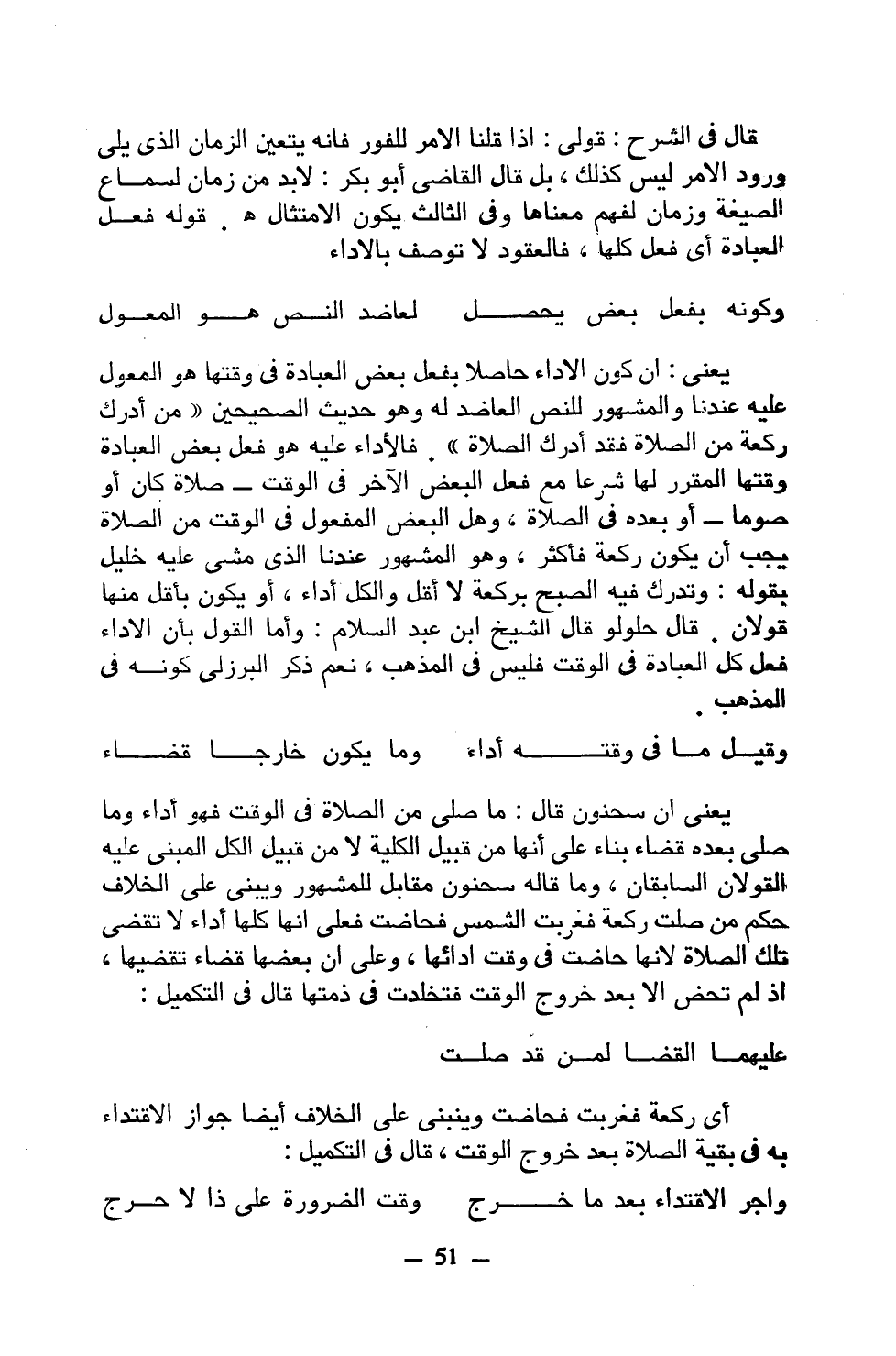 قال في الشرح: قولي: إذا قلنا الأمر للفور فإنه يتعين الزمان الذي يلي ورود الأمر ليس كذلك، بل قال القاضي أبو بكر: لابد من زمان لسماع الصيغة وزمان لفهم معناها وفي الثالث يكون الامتثال هـ. قوله فعل العبادة أي فعل كلها، فالعقود لا توصف بالأداء.