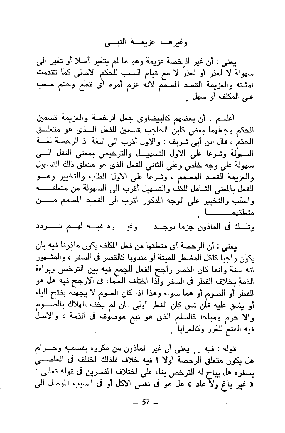 يعني: أن غير الرخصة عزيمة وهو ما لم يتغير أصلًا أو تغير إلى سهولة لا لعذر أو لعذر لا مع قيام السبب للحكم الأصلي كما تقدمت أمثلته والعزيمة القصد المصمم لأنه عزم أمره أي قطع وحتم صعب على المكلف أو سهل.