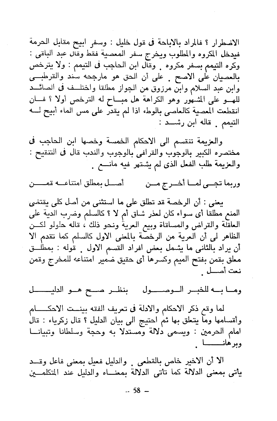 يعني: أن الرخصة قد تطلق على ما استثنى من أصل كلي يقتضي المنع مطلقًا أي سواء كان لعذر شاق أم لا؟ كالسلم وضرب الدية على العاقلة والقراض والمساقاة وبيع العرية ونحو ذلك، قاله حلولو لكن الظاهر لي أن العرية من الرخصة بالمعنى الأول كالسلم كما تقدم إلا أن يراد بالثاني ما يشمل بعض أفراد القسم الأول. قوله: بمطلق معلق بقمن بفتح الميم وكسرها أي حقيق ضمير امتناعه للمخرج وقمن نعت أصل.