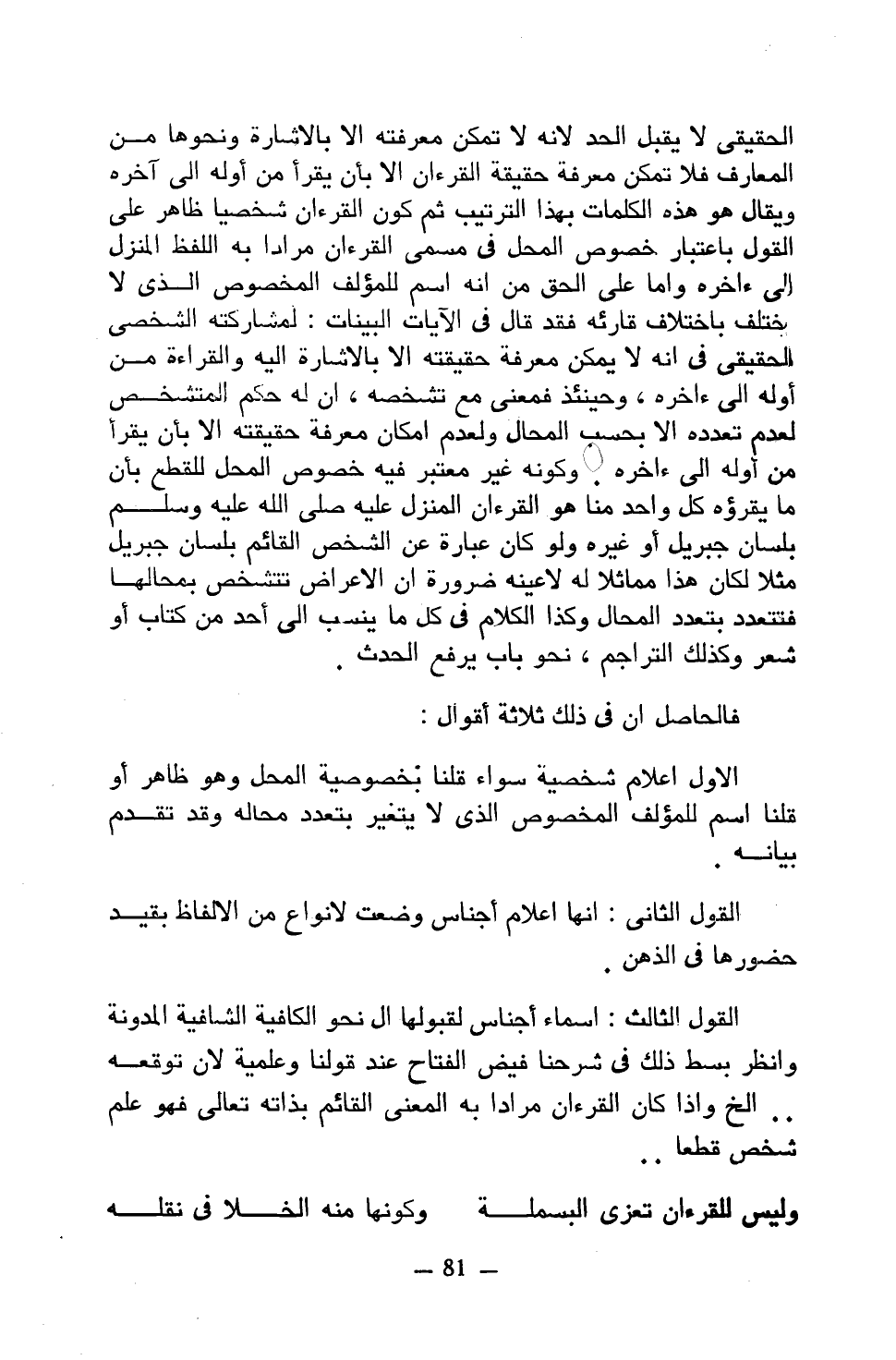 الحقيقي لا يقبل الحد لأنه لا تمكن معرفته إلا بالإشارة ونحوها من المعارف لا تمكن معرفة حقيقة القرءان إلا بأن يقرأ من أوله إلى آخره ويقال هو هذه الكلمات بهذا الترتيب ثم كون القرءان شخصيًا ظاهر على القول باعتبار خصوص المحل في مسمى القرءان مرادًا به اللفظ المنزل إلى ءاخره وإما على الحق من أنه اسم للمؤلف المخصوص الذي لا يختلف باختلاف قارئه فقد قال في الآيات البينات: لمشاركته الشخصي الحقيقي في إنه لا يمكن معرفة حقيقته إلا بالإشارة إليه والقراءة من أوله إلى ءاخره، وحينئذ فمعنى مع تشخصه، إن له حكم المتشخص لعدم تعدده إلا بحسب المحال ولعدم إمكان معرفة حقيقته إلا بأن يقرأ من أوله إلى ءاخره. وكونه غير معتبر فيه خصوص المحل للقطع بأن ما يقرؤه كل واحد منا هو القرءان المنزل عليه صلى الله عليه وسلم بلسان جبريل أو غيره ولو كان عبارة عن الشخص القائم بلسان جبريل مثلًا لكان هذا مماثلًا له لا عينه ضرورة أن الأعراض تتشخص بمحالها فتتعدد بتعدد المحال وكذا الكلام في كل ما ينسب إلى أحد من كتاب أو شعر وكذلك التراجم، نحو باب يرفع الحدث.