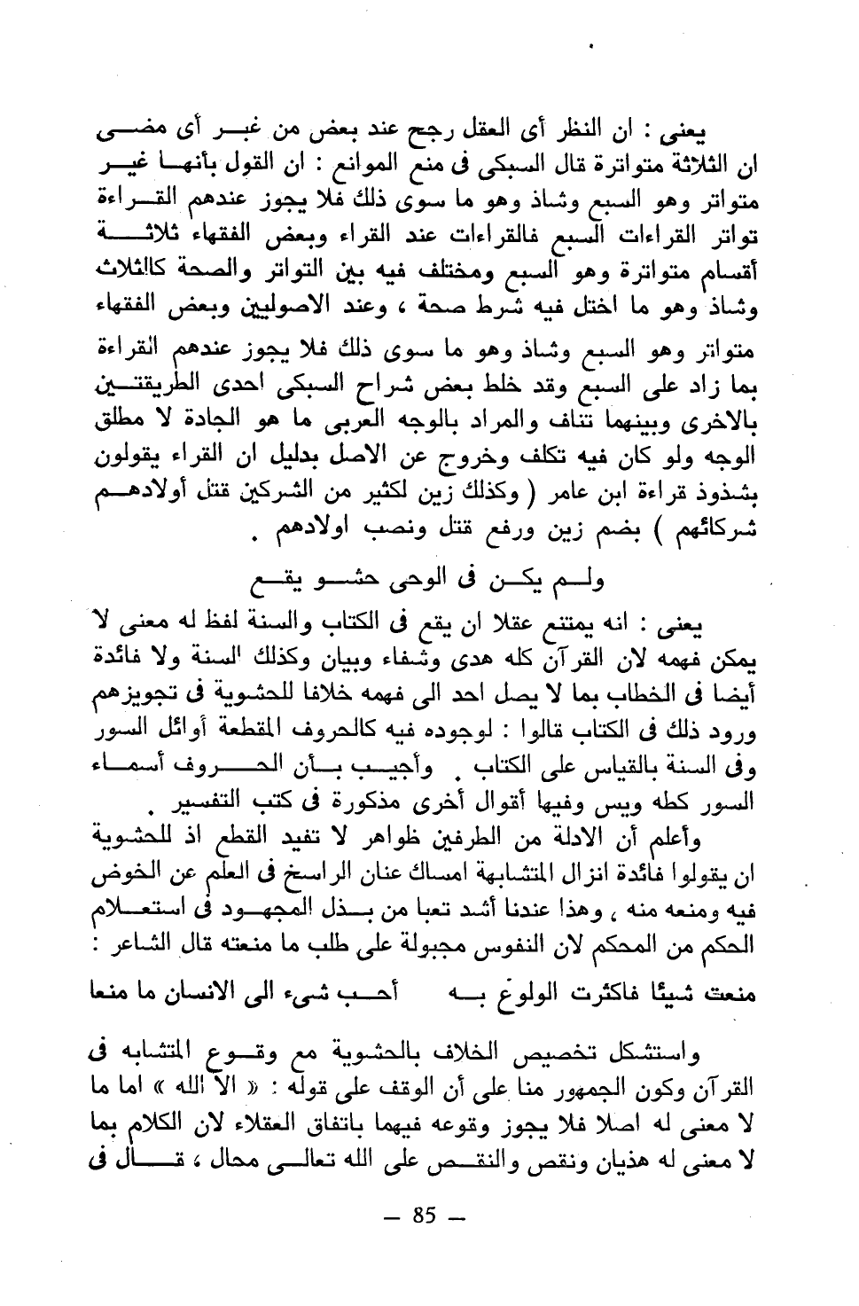 واستشكل تخصيص الخلاف بالحشوية مع وقع المتشابه في القرآن وكون الجمهور منا على أن الوقف على قوله: ((إلا الله)) إما ما لا معنى له أصلًا فلا يجوز وقوعه فيهما باتفاق العقلاء لأن الكلام بما لا معنى له هذيان ونقص والنقص على الله تعالى محال، قال في