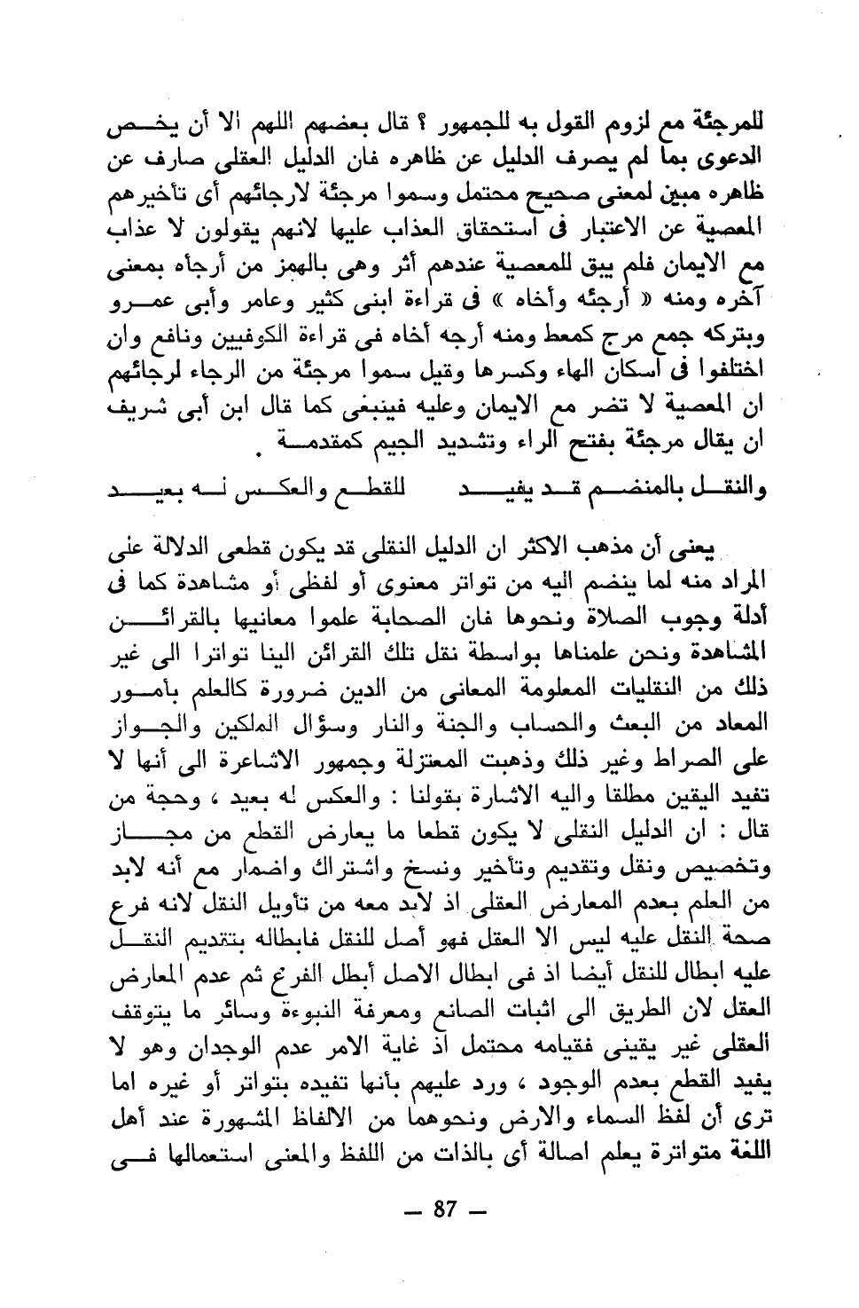 للمرجئة مع لزوم القول به للجمهور؟ قال بعضهم اللهم إلا أن يخص الدعوى بما لم يصرف الدليل عن ظاهره فإن الدليل العقلي صارف عن ظاهره مبين لمعنى صحيح محتمل وسموا مرجئة لإرجائهم أي تأخيرهم المعصية عن الاعتبار في استحقاق العذاب عليها لأنهم يقولون لا عذاب مع الإيمان فلم يبق للمعصية عندهم أثر وهي بالهمز من أرجأه بمعنى آخره ومنه ((أرجئه وأخاه)) في قراءة ابني كثير وعامر وأبي عمرو وبتركه جمع مرج كمعط ومنه أرجه أخاه في قراءة الكوفيين ونافع وإن اختلفوا في إسكان الهاء وكسرها وقيل سموا مرجئة من الرجاء لرجائهم أن المعصية لا تضر مع الإيمان وعليه فينبغي كما قال ابن أبي شريف أن يقال مرجئة بفتح الراء وتشديد الجيم كمقدمة.