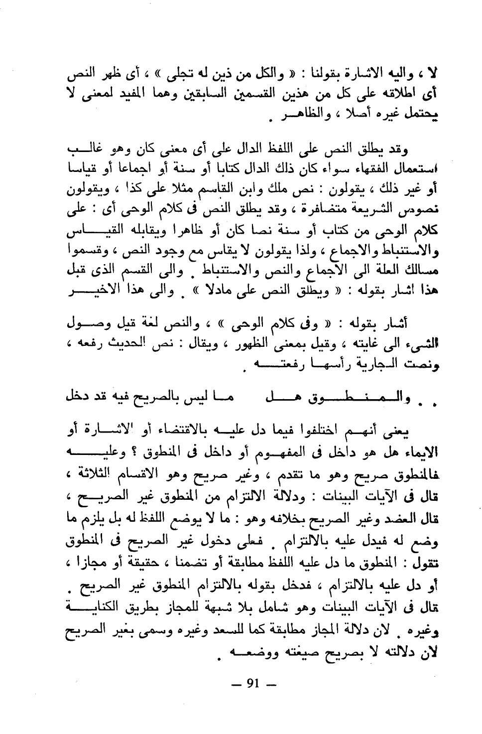 وقد يطلق النص على اللفظ الدال على أي معنى كان وهو غالب استعمال الفقهاء سواء كان ذلك الدال كتابًا أو سنة أو إجماعًا أو قياسًا أو غير ذلك، يقولون: نص ملك وابن القاسم مثلًا على كذا، ويقولون نصوص الشريعة متضافرة، وقد يطلق النص في كلام الوحي أي: على كلام الوحي من كتاب أو سنة نصًا كان أو ظاهرًا ويقابله القياس والاستنباط والإجماع، ولذا يقولون لا يقاس مع وجود النص، وقسموا مسالك العلة إلى الإجماع والنص والاستنباط. وإلى القسم الذي قبل هذا أشار بقوله: «ويطلق النص على ما دلا». وإلى هذا الأخير