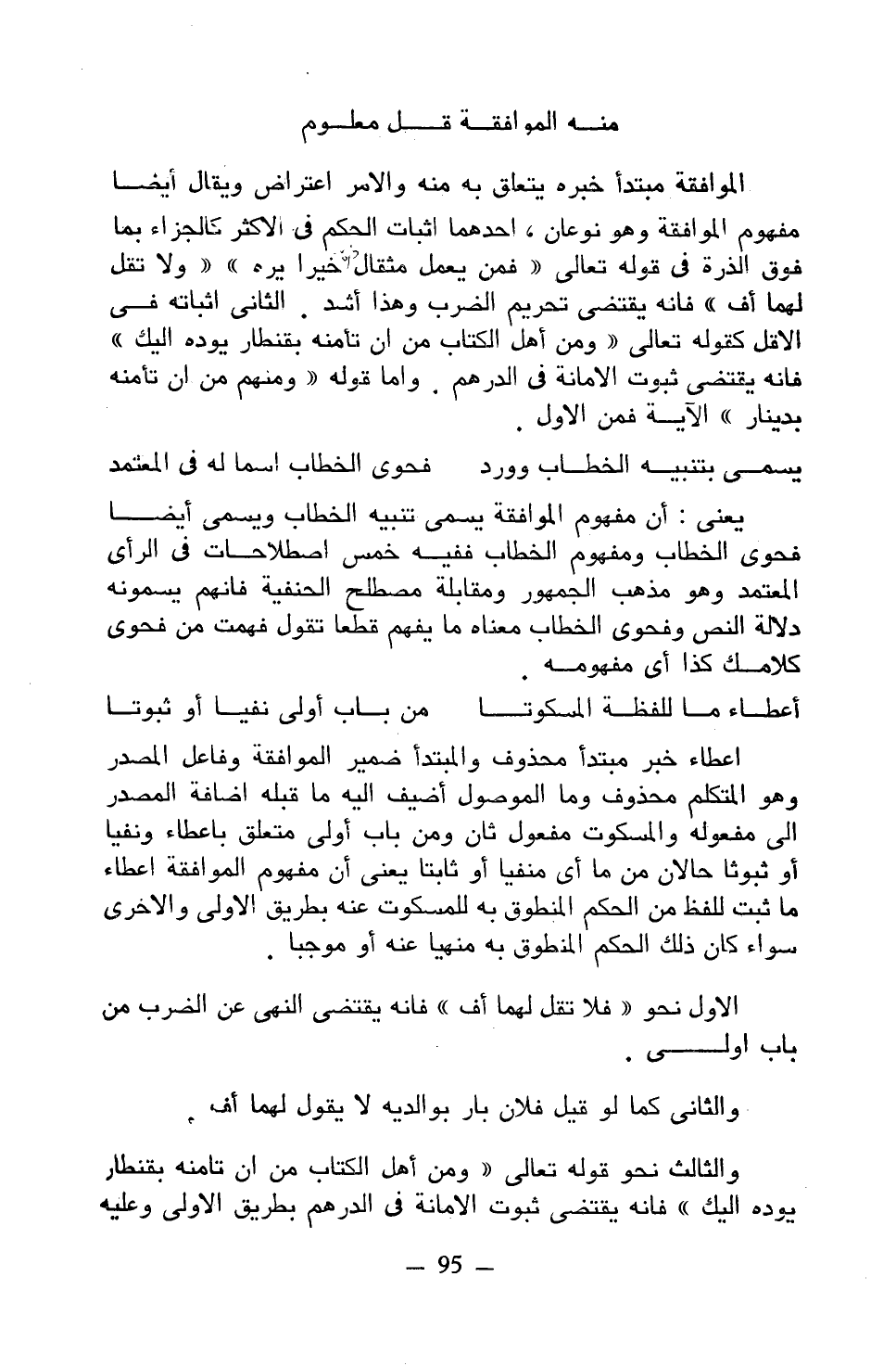 الموافقة مبتدأ خبره يتعلق به منه والأمر اعتراض ويقال أيضًا مفهوم الموافقة وهو نوعان، أحدهما إثبات الحكم في الأكثر كالجزاء بما فوق الذرة في قوله تعالى ((فمن يعمل مثقال ذرةً خيرًا يره)) ((ولا تقل لهما أف)) فإنه يقتضي تحريم الضرب وهذا أشد. الثاني إثباته في الأقل كقوله تعالى ((ومن أهل الكتاب من أن تأمنه بقنطار يوده إليك)) فإنه يقتضي ثبوت الأمانة في الدرهم. وأما قوله ((ومنهم من أن تأمنه بدينار)) الآية فمن الأول.