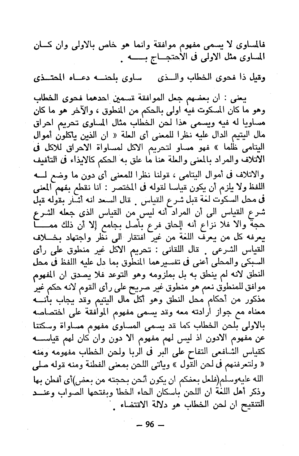 يعني: أن بعضهم جعل الموافقة قسمي أحدهما فحوى الخطاب وهو ما كان المسكوت فيه أولى بالحكم من المنطوق، والآخر هو ما كان مساويًا له فيه ويسمى هذا لحن الخطاب مثال المساوي تحريم إحراق مال اليتيم الدال عليه نظرًا للمعنى أي العلة ((إن الذي يأكلون أموال اليتامى ظلمًا)) فهو مساو لتحريم الأكل لمساواة الإحراق للأكل في الإتلاف والمراد بالمعنى والعلة هنا ما علق به الحكم كالإيذاء في التأفيف والإتلاف في أموال اليتامى، قولنا نظرًا للمعنى أي دون ما وضع له اللفظ ولا يلزم أن يكون قياسًا لقوله في المختصر: إنا نقطع بفهم المعنى في محل السكوت لغة قبل شرع القياس. قال السعد أنه أشار بقوله قبل شرع القياس إلى أن المراد أنه ليس من القياس الذي جعله الشرع حجة وإلا فلا نزاع أنه إلحاق فرع بأصل بجامع إلا أن ذلك مما يعرفه كل من يعرف اللغة من غير افتقار إلى نظر واجتهاد بخلاف القياس الشرعي. قال اللقاني: تحريم الأكل غير منطوق على رأي السبكي والمحلي أعني في تفسيرهما المنطوق بما دل عليه اللفظ في محل النطق لأنه لم ينطق به بل بملزومه وهو التوعد فلا يصدق أن المفهوم موافق للمنطوق نعم هو منطوق غير صريح على رأي القوم لأنه حكم غير مذكور من أحكام محل النطق وهو أكل مال اليتيم وقد يجاب بأنه معناه مع جواز إرادته معه وقد يسمى مفهوم الموافقة على اختصاصه بالأولى بلحن الخطاب كما قد يسمى المساوي مفهوم المساواة وسكتنا عن مفهوم الأدون إذ ليس لهم مفهوم إلا دون وإن كان لهم قياسه كقياس الشافعي التفاح على البر في الربا ولحن الخطاب مفهومه ومنه ((ولتعرفنهم في لحن القول)) ويأتي اللحن بمعنى الفطنة ومنه قوله صلى الله عليه وسلم (فلعل بعضكم أن يكون ألحن بحجته من بعض) أي أفطن بها وذكر أهل اللغة أن اللحن بإسكان الحاء الخطأ وبفتحها الصواب وعند التنقيح أن لحن الخطاب هو دلالة الاقتضاء.