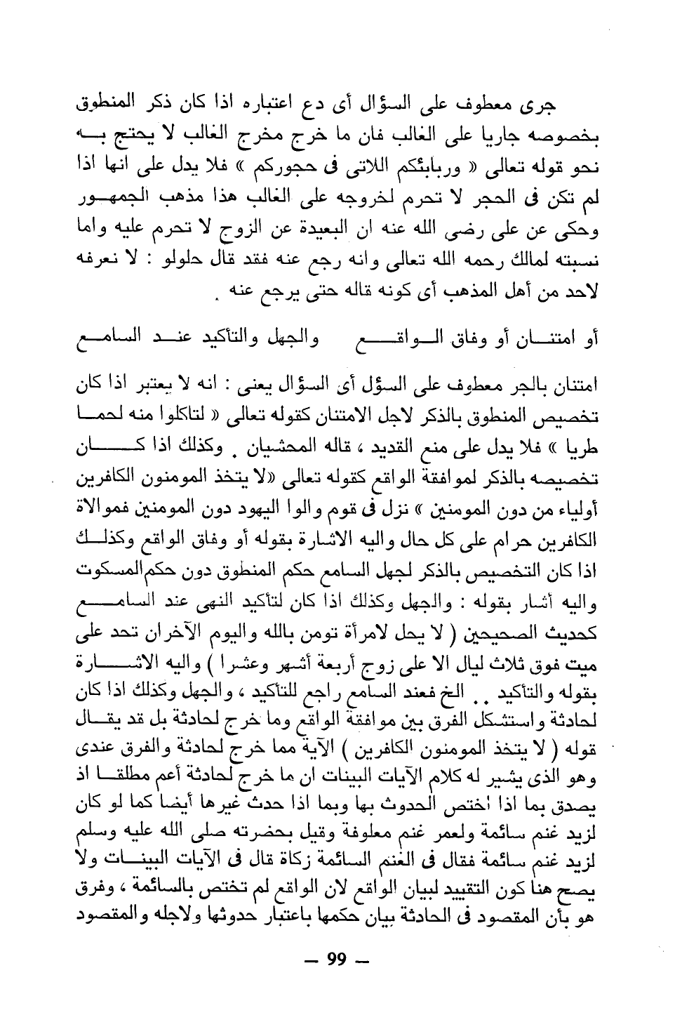 امتنان بالجر معطوف على السؤال أي السؤال يعني: أنه لا يعتبر إذا كان تخصيص المنطوق بالذكر لأجل الامتنان كقوله تعالى ((لتأكلوا منه لحمًا طريًا)) فلا يدل على منع القديد، قاله المحشيان. وكذلك إذا كان تخصيصه بالذكر لموافقة الواقع كقوله تعالى ((لا يتخذ المؤمنون الكافرين أولياء من دون المؤمنين)) نزل في قوم والوا اليهود دون المؤمنين فموالاة الكافرين حرام على كل حال وإليه الإشارة بقوله أو وفاق الواقع وكذلك إذا كان التخصيص بالذكر لجهل السامع حكم المنطوق دون حكم المسكوت وإليه أشار بقوله: والجهل وكذلك إذا كان لتأكيد النهي عند السامع كحديث الصحيحين (لا يحل لامرأة تؤمن بالله واليوم الآخر أن تحد على ميت فوق ثلاث ليال إلا على زوج أربعة أشهر وعشرا) وإليه الإشارة بقوله والتأكيد .. الخ فعند السامع راجع للتأكيد، والجهل وكذلك إذا كان لحادثة واستشكل الفرق بين موافقة الواقع وخرج لحادثة بل قد يقال قوله ((لا يتخذ المؤمنين الكافرين)) الآية مما خرج لحادثة والفرق عندي وهو الذي يشير له كلام الآيات البينات إن ما خرج لحادثة أعم مطلقًا إذ يصدق بما إذا اختص الحدوث بها وبما إذا حدث غيرها أيضًا كما لو كان لزيد غنم سائمة ولعمر غنم معلوفة وقيل بحضرته صلى الله عليه وسلم لزيد غنم سائمة فقال في الغنم السائمة زكاة قال في الآيات البينات ولا يصح هنا كون التقييد لبيان الواقع لأن الواقع لم تختص بالسائمة، وفرق هو بأن المقصود في الحادثة بيان حكمها باعتبار حدوثها ولأجله والمقصود