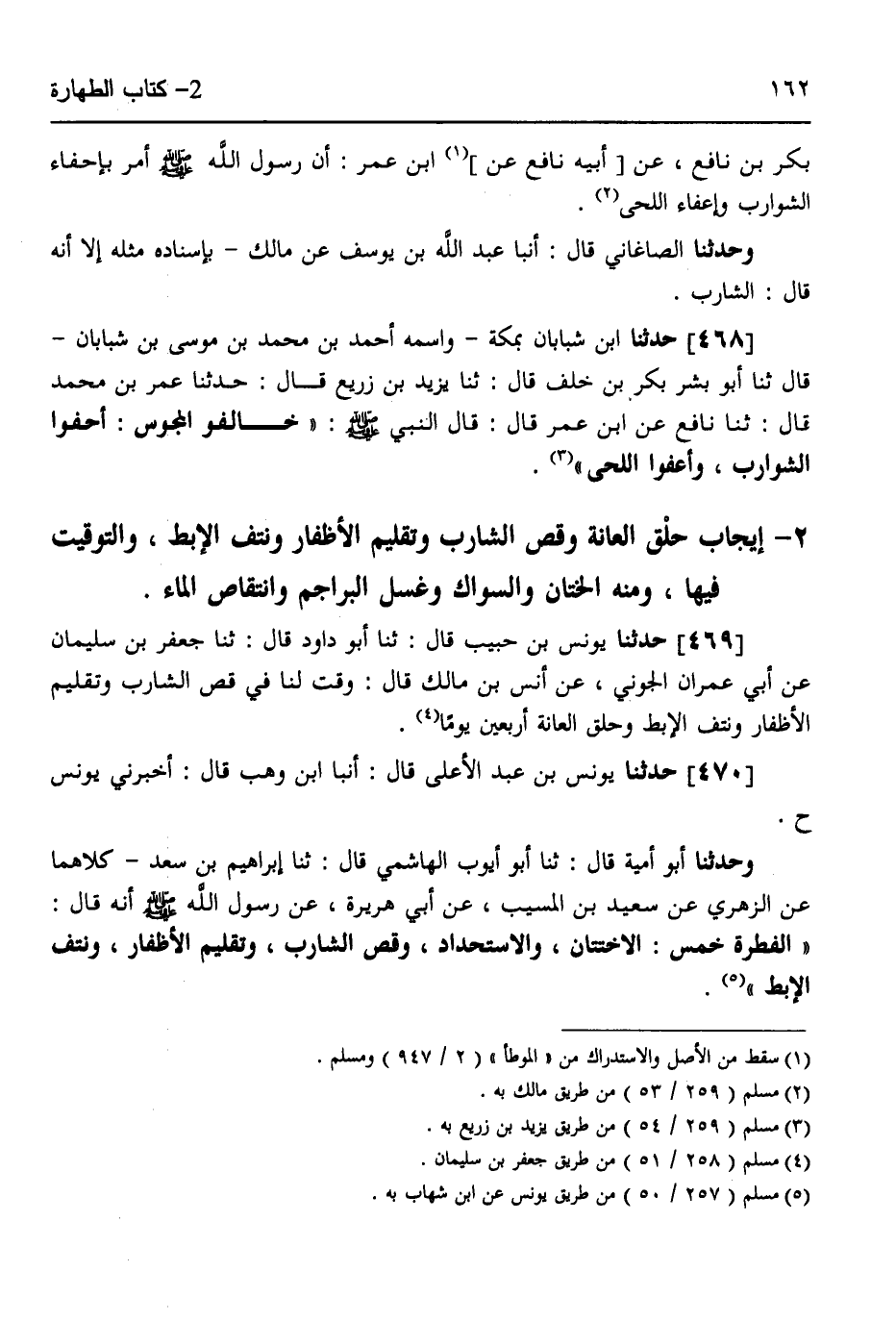 470 - حَدَّثَنَا يُونُسُ بْنُ عَبْدِ الْأَعْلَى قَالَ: أنبا ابْنُ وَهْبٍ قَالَ: أَخْبَرَنِي يُونُسُ ح، وَحَدَّثَنَا أَبُو أُمَيَّةَ قَالَ: ثنا أَبُو أَيُّوبَ الْهَاشِمِيُّ قَالَ: ثنا إِبْرَاهِيمُ بْنُ سَعْدٍ كِلَاهُمَا، عَنِ الزُّهْرِيِّ، عَنْ سَعِيدِ بْنِ الْمُسَيِّبِ، عَنْ أَبِي هُرَيْرَةَ، عَنْ رَسُولِ اللَّهِ صَلَّى اللهُ عَلَيْهِ وَسَلَّمَ أَنَّهُ قَالَ: " §الْفِطْرَةُ خَمْسٌ: الِاخْتِتَانُ وَالِاسْتِحْدَادُ، وَقَصُّ الشَّارِبِ، وَتَقْلِيمُ الْأَظْفَارِ، وَنَتْفُ الْإِبْطِ "