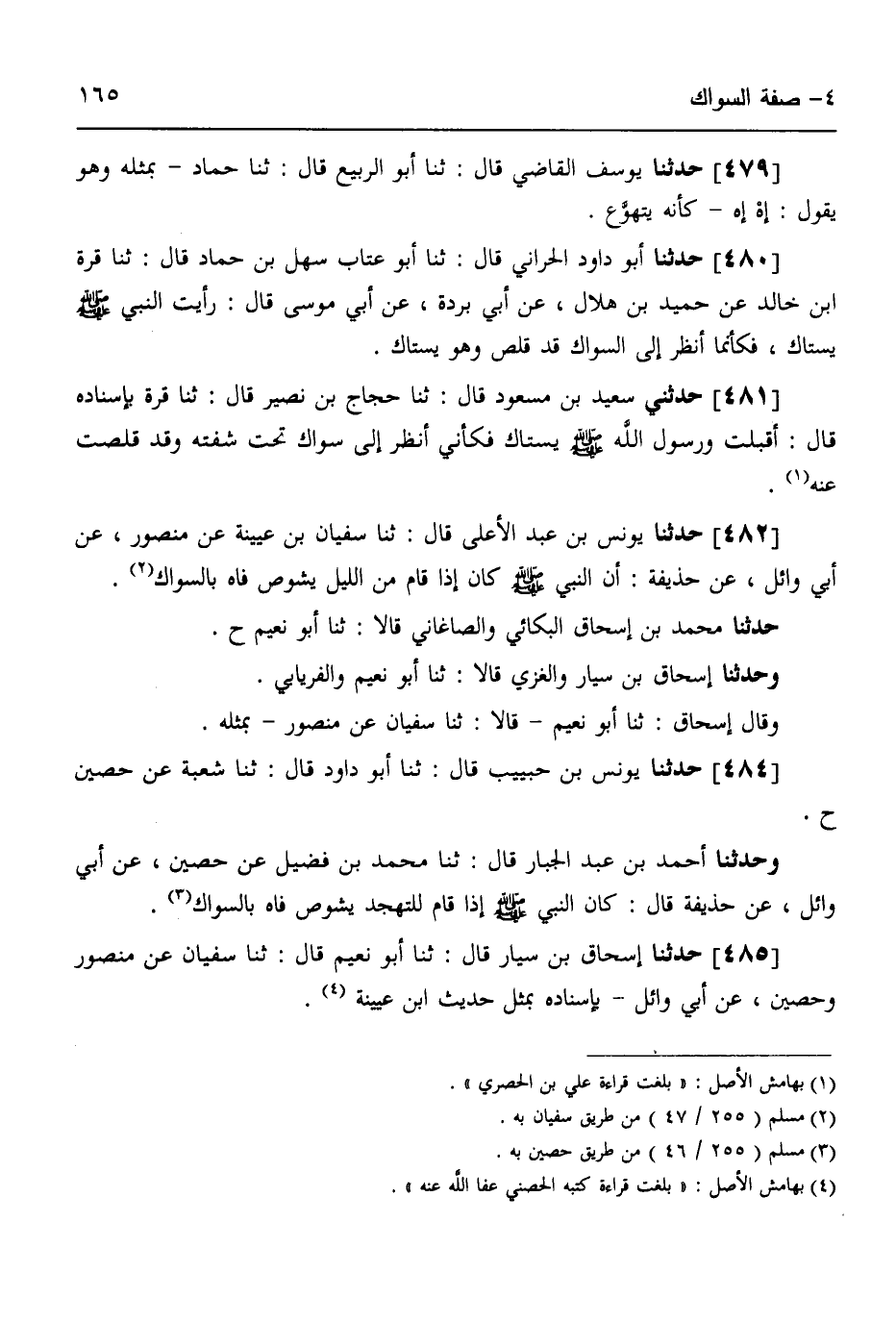 482 - حَدَّثَنَا يُونُسُ بْنُ عَبْدِ الْأَعْلَى قَالَ: ثنا سُفْيَانُ بْنُ عُيَيْنَةَ، عَنْ مَنْصُورٍ، عَنْ أَبِي وَائِلٍ، عَنْ حُذَيْفَةَ، أَنَّ النَّبِيَّ صَلَّى اللهُ عَلَيْهِ وَسَلَّمَ كَانَ «§إِذَا قَامَ مِنَ اللَّيْلِ يَشُوصُ فَاهُ بِالسِّوَاكِ» حَدَّثَنَا مُحَمَّدُ بْنُ إِسْحَاقَ الْبَكَّائِيُّ وَالصَّاغَانِيُّ قَالَا: ثنا أَبُو نُعَيْمٍ ح، وَحَدَّثَنَا إِسْحَاقُ بْنُ سَيَّارٍ وَالْغَزِّيُّ قَالَا: ثنا أَبُو نُعَيْمٍ وَالْفِرْيَابِيُّ وَقَالَ إِسْحَاقُ: ثنا أَبُو نُعَيْمٍ قَالَا: ثنا سُفْيَانُ، عَنْ مَنْصُورٍ بِمِثْلِهِ